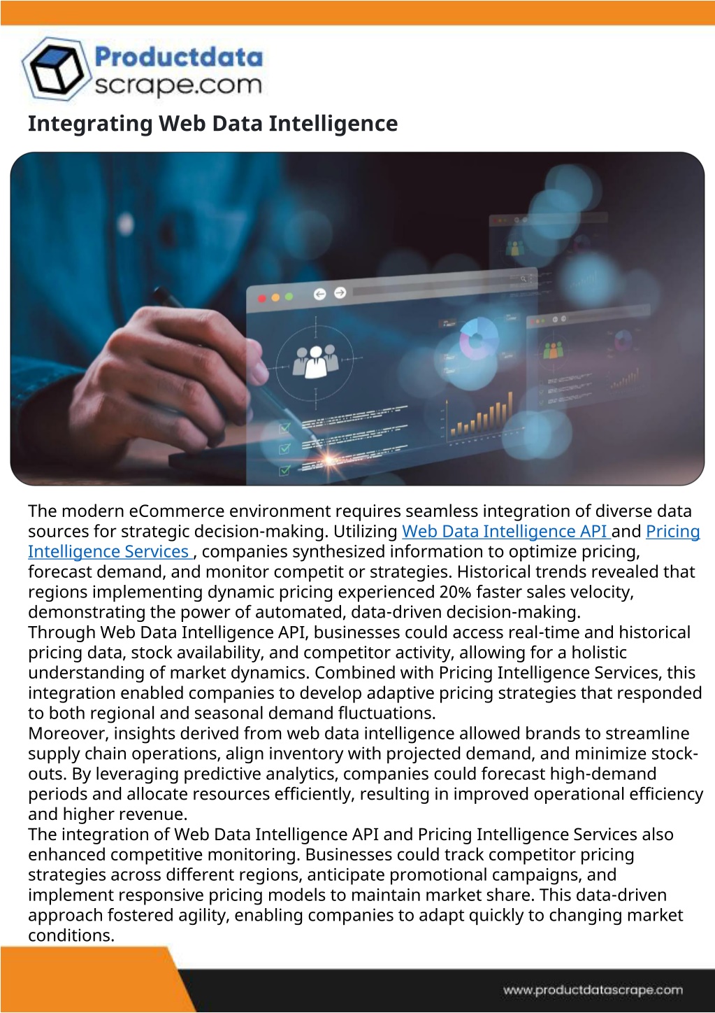 Integrating Web Data Intelligence The modern eCommerce environment requires seamless integration of diverse data sources for strategic decision-making. Utilizing Web Data Intelligence API and Pricing Intelligence Services , companies synthesized information to optimize pricing, forecast demand, and monitor competit or strategies. Historical trends revealed that regions implementing dynamic pricing experienced 20% faster sales velocity, demonstrating the power of automated, data-driven decision-making. Through Web Data Intelligence API, businesses could access real-time and historical pricing data, stock availability, and competitor activity, allowing for a holistic understanding of market dynamics. Combined with Pricing Intelligence Services, this integration enabled companies to develop adaptive pricing strategies that responded to both regional and seasonal demand fluctuations. Moreover, insights derived from web data intelligence allowed brands to streamline supply chain operations, align inventory with projected demand, and minimize stock-outs. By leveraging predictive analytics, companies could forecast high-demand periods and allocate resources efficiently, resulting in improved operational efficiency and higher revenue. The integration of Web Data Intelligence API and Pricing Intelligence Services also enhanced competitive monitoring. Businesses could track competitor pricing strategies across different regions, anticipate promotional campaigns, and implement responsive pricing models to maintain market share. This data-driven approach fostered agility, enabling companies to adapt quickly to changing market conditions.