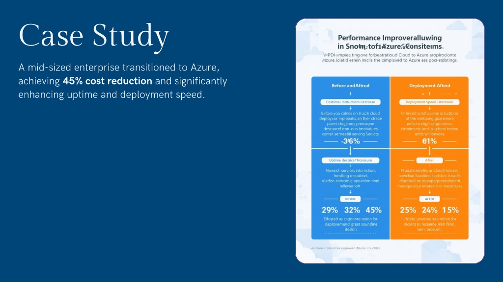 9. Case Study A mid-sized enterprise transitioned to Azure, achieving 45% cost reduction and significantly enhancing uptime and deployment speed.