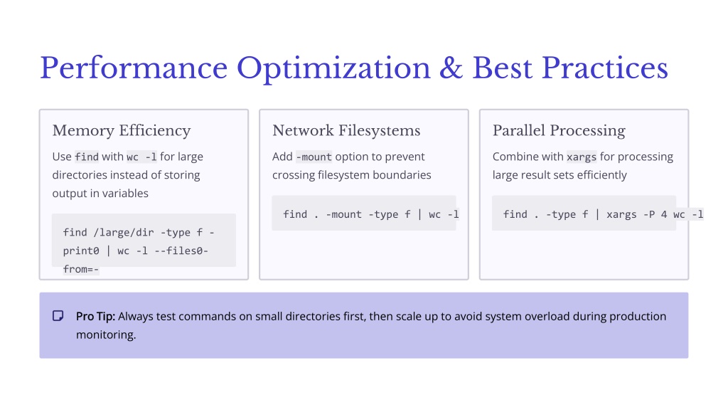 Performance Optimization & Best Practices Memory Efficiency Network Filesystems Parallel Processing Use find with wc -l for large directories instead of storing output in variables Add -mount option to prevent crossing filesystem boundaries Combine with xargs for processing large result sets efficiently find . -mount -type f | wc -l find . -type f | xargs -P 4 wc -l find /large/dir -type f - print0 | wc -l --files0- from=- Pro Tip: Pro Tip: Always test commands on small directories first, then scale up to avoid system overload during production monitoring.