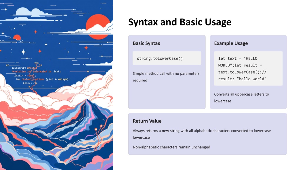 Syntax and Basic Usage Basic Syntax Example Usage string.toLowerCase() let text = "HELLO WORLD";let result = text.toLowerCase();// result: "hello world" Simple method call with no parameters required Converts all uppercase letters to lowercase Return Value Always returns a new string with all alphabetic characters converted to lowercase Non-alphabetic characters remain unchanged