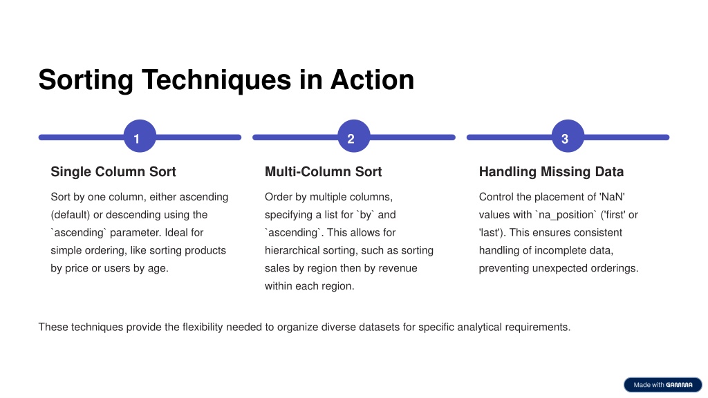 Sorting Techniques in Action 1 2 3 Single Column Sort Multi-Column Sort Handling Missing Data Sort by one column, either ascending (default) or descending using the `ascending` parameter. Ideal for simple ordering, like sorting products by price or users by age. Order by multiple columns, specifying a list for `by` and `ascending`. This allows for hierarchical sorting, such as sorting sales by region then by revenue within each region. Control the placement of 'NaN' values with `na_position` ('first' or 'last'). This ensures consistent handling of incomplete data, preventing unexpected orderings. These techniques provide the flexibility needed to organize diverse datasets for specific analytical requirements.