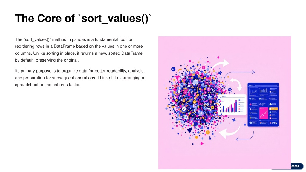 The Core of `sort_values()` The `sort_values()` method in pandas is a fundamental tool for reordering rows in a DataFrame based on the values in one or more columns. Unlike sorting in place, it returns a new, sorted DataFrame by default, preserving the original. Its primary purpose is to organize data for better readability, analysis, and preparation for subsequent operations. Think of it as arranging a spreadsheet to find patterns faster.