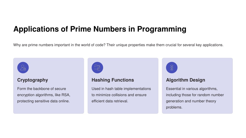 Applications of Prime Numbers in Programming Why are prime numbers important in the world of code? Their unique properties make them crucial for several key applications. Cryptography Hashing Functions Algorithm Design Form the backbone of secure encryption algorithms, like RSA, protecting sensitive data online. Used in hash table implementations to minimize collisions and ensure efficient data retrieval. Essential in various algorithms, including those for random number generation and number theory problems.