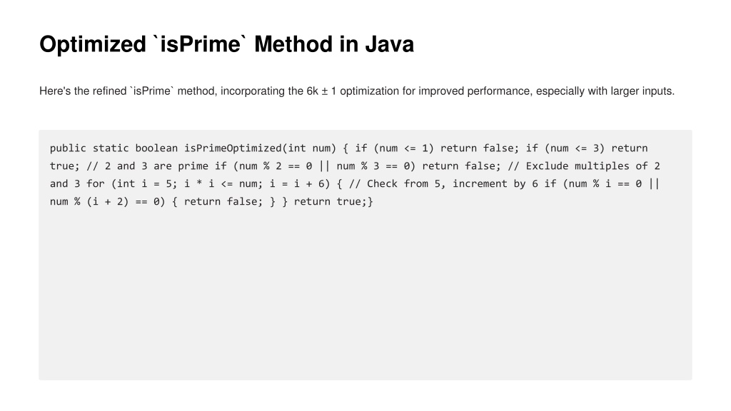 Optimized `isPrime` Method in Java Here's the refined `isPrime` method, incorporating the 6k ± 1 optimization for improved performance, especially with larger inputs. public static boolean isPrimeOptimized(int num) { if (num <= 1) return false; if (num <= 3) return true; // 2 and 3 are prime if (num % 2 == 0 || num % 3 == 0) return false; // Exclude multiples of 2 and 3 for (int i = 5; i * i <= num; i = i + 6) { // Check from 5, increment by 6 if (num % i == 0 || num % (i + 2) == 0) { return false; } } return true;}
