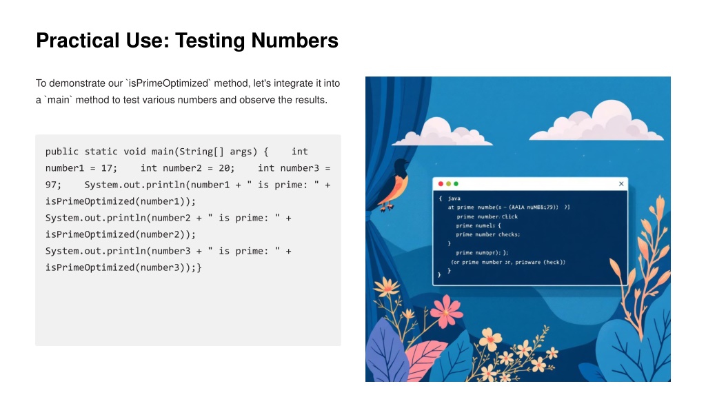 Practical Use: Testing Numbers To demonstrate our `isPrimeOptimized` method, let's integrate it into a `main` method to test various numbers and observe the results. public static void main(String[] args) { int number1 = 17; int number2 = 20; int number3 = 97; System.out.println(number1 + " is prime: " + isPrimeOptimized(number1)); System.out.println(number2 + " is prime: " + isPrimeOptimized(number2)); System.out.println(number3 + " is prime: " + isPrimeOptimized(number3));}