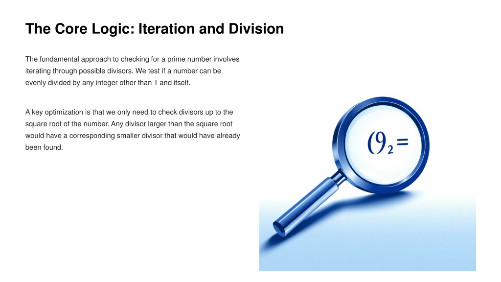 The Core Logic: Iteration and Division The fundamental approach to checking for a prime number involves iterating through possible divisors. We test if a number can be evenly divided by any integer other than 1 and itself. A key optimization is that we only need to check divisors up to the square root of the number. Any divisor larger than the square root would have a corresponding smaller divisor that would have already been found.