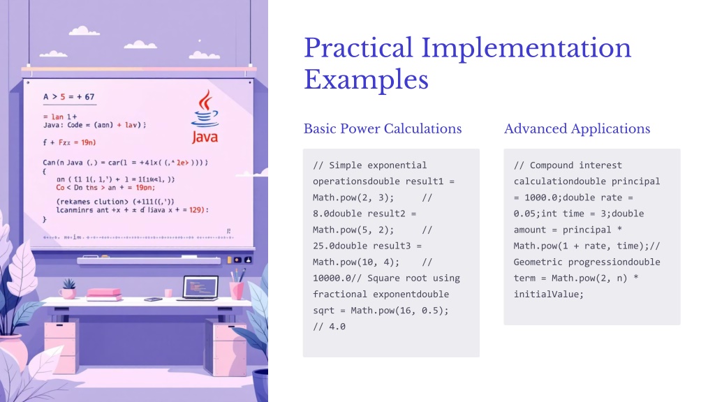 Practical Implementation Examples Basic Power Calculations Advanced Applications // Simple exponential operationsdouble result1 = Math.pow(2, 3); // 8.0double result2 = Math.pow(5, 2); // 25.0double result3 = Math.pow(10, 4); // 10000.0// Square root using fractional exponentdouble sqrt = Math.pow(16, 0.5); // 4.0 // Compound interest calculationdouble principal = 1000.0;double rate = 0.05;int time = 3;double amount = principal * Math.pow(1 + rate, time);// Geometric progressiondouble term = Math.pow(2, n) * initialValue;
