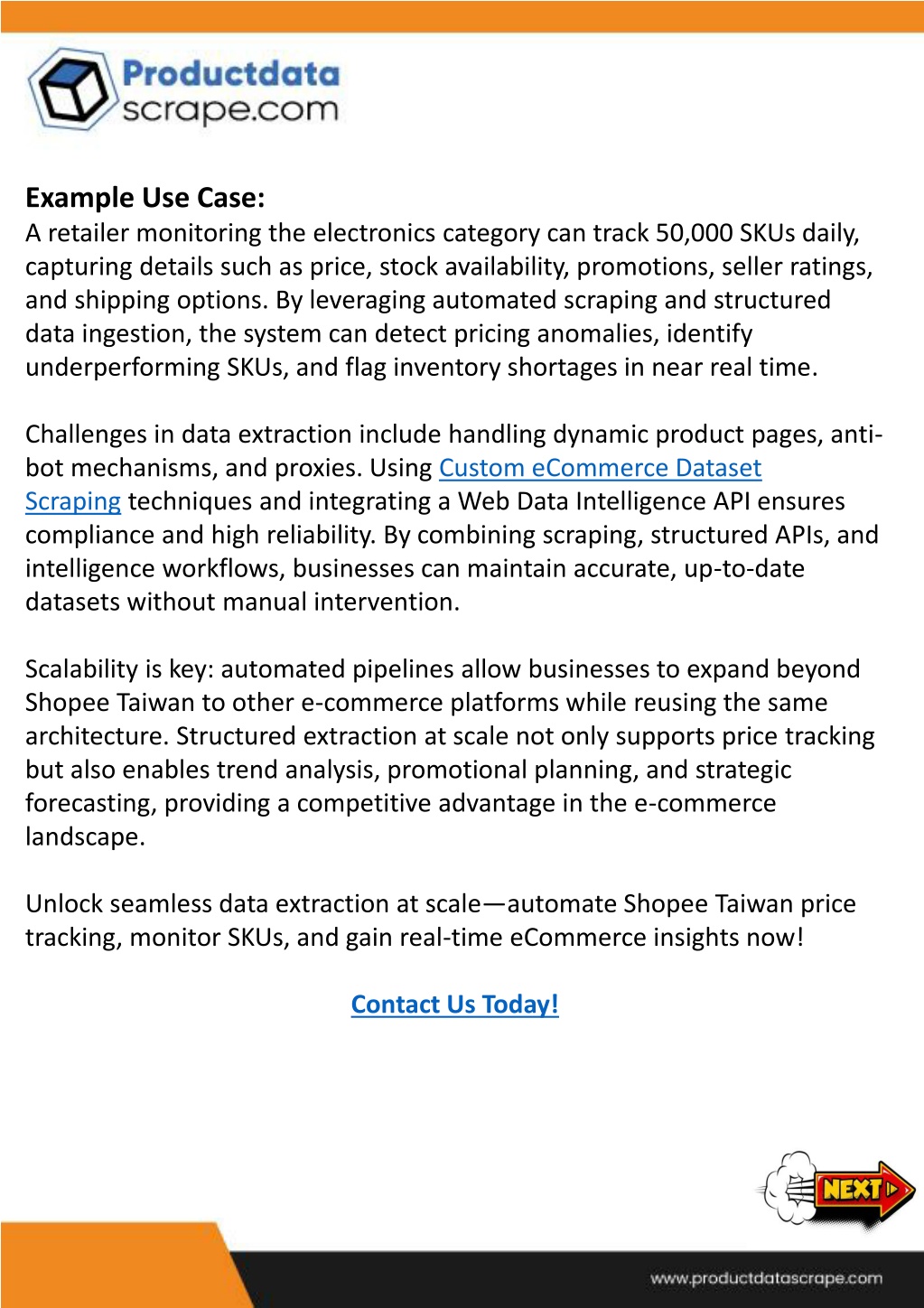 Example Use Case: A retailer monitoring the electronics category can track 50,000 SKUs daily, capturing details such as price, stock availability, promotions, seller ratings, and shipping options. By leveraging automated scraping and structured data ingestion, the system can detect pricing anomalies, identify underperforming SKUs, and flag inventory shortages in near real time. Challenges in data extraction include handling dynamic product pages, anti-bot mechanisms, and proxies. Using Custom eCommerce Dataset Scraping techniques and integrating a Web Data Intelligence API ensures compliance and high reliability. By combining scraping, structured APIs, and intelligence workflows, businesses can maintain accurate, up-to-date datasets without manual intervention. Scalability is key: automated pipelines allow businesses to expand beyond Shopee Taiwan to other e-commerce platforms while reusing the same architecture. Structured extraction at scale not only supports price tracking but also enables trend analysis, promotional planning, and strategic forecasting, providing a competitive advantage in the e-commerce landscape. Contact Us Today! Example Use Case: A retailer monitoring the electronics category can track 50,000 SKUs daily, capturing details such as price, stock availability, promotions, seller ratings, and shipping options. By leveraging automated scraping and structured data ingestion, the system can detect pricing anomalies, identify underperforming SKUs, and flag inventory shortages in near real time. Unlock seamless data extraction at scale—automate Shopee Taiwan price tracking, monitor SKUs, and gain real-time eCommerce insights now! Challenges in data extraction include handling dynamic product pages, anti- bot mechanisms, and proxies. Using Custom eCommerce Dataset Scraping techniques and integrating a Web Data Intelligence API ensures compliance and high reliability. By combining scraping, structured APIs, and intelligence workflows, businesses can maintain accurate, up-to-date datasets without manual intervention. Scalability is key: automated pipelines allow businesses to expand beyond Shopee Taiwan to other e-commerce platforms while reusing the same architecture. Structured extraction at scale not only supports price tracking but also enables trend analysis, promotional planning, and strategic forecasting, providing a competitive advantage in the e-commerce landscape. Unlock seamless data extraction at scale—automate Shopee Taiwan price tracking, monitor SKUs, and gain real-time eCommerce insights now! Contact Us Today!