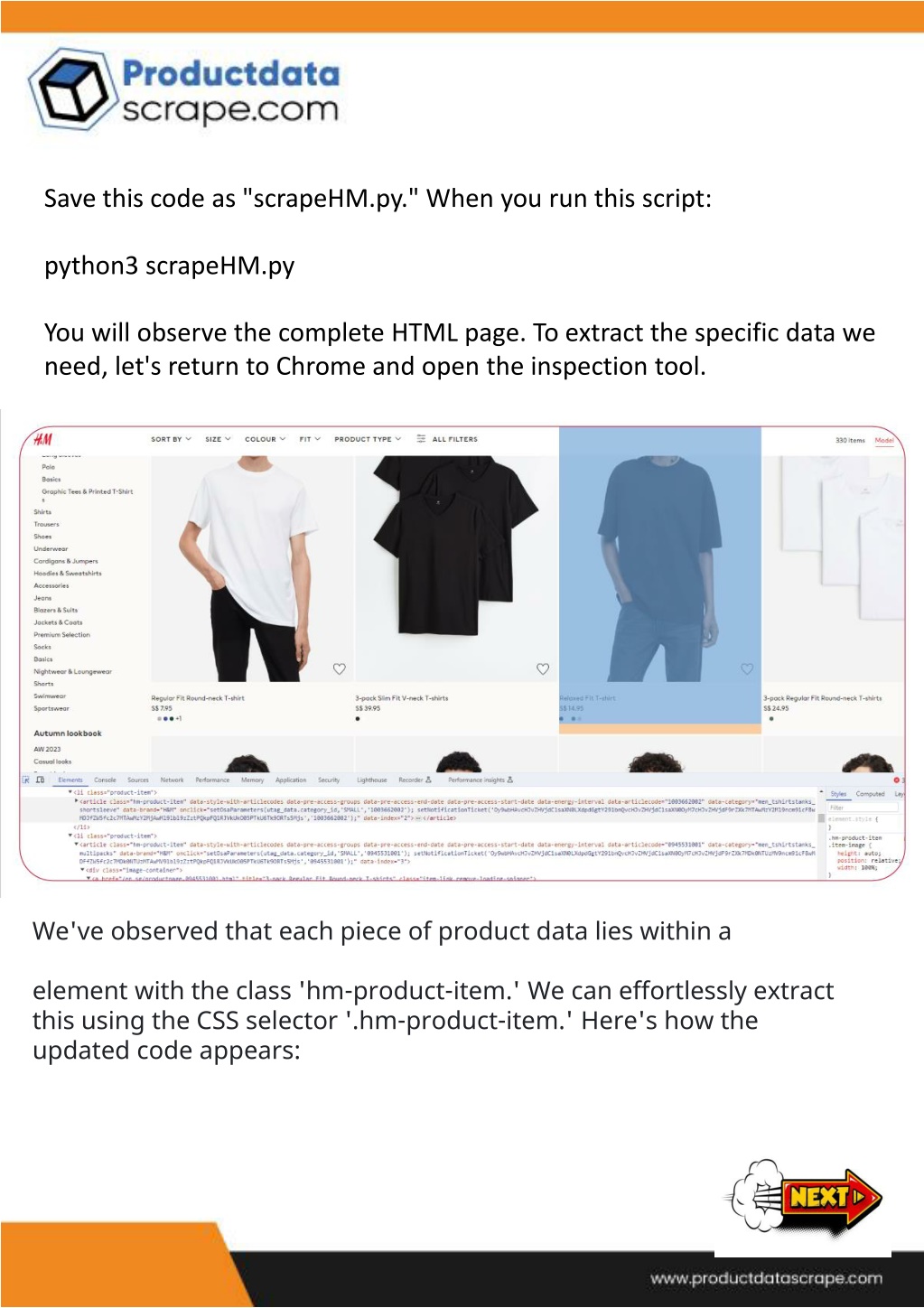 Save this code as "scrapeHM.py." When you run this script: python3 scrapeHM.py You will observe the complete HTML page. To extract the specific data we need, let's return to Chrome and open the inspection tool. We've observed that each piece of product data lies within a element with the class 'hm-product-item.' We can effortlessly extract this using the CSS selector '.hm-product-item.' Here's how the updated code appears: