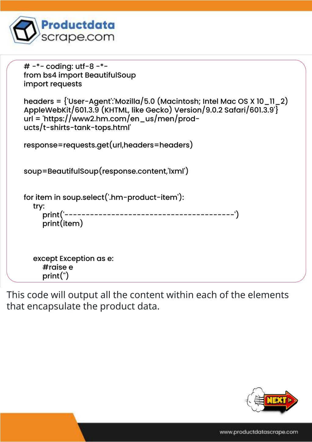 Before we begin, ensure you have Python 3 installed on your system. If you don't already have it, you can easily install Python 3 before proceeding. Next, you can install BeautifulSoup by running the following command: Next, you can install BeautifulSoup by running the following command: pip install beautifulsoup4 To fetch data, parse it into XML, and utilize CSS selectors, we'll require the following libraries: requests, lxml, and soupsieve. You can install these libraries by executing the following commands: pip3 install request soupsievelxml After installing the required libraries, open a text editor and enter the following code: Now, navigate the H&M products listing page and examine the available data. Here's a visual representation of the page structure: