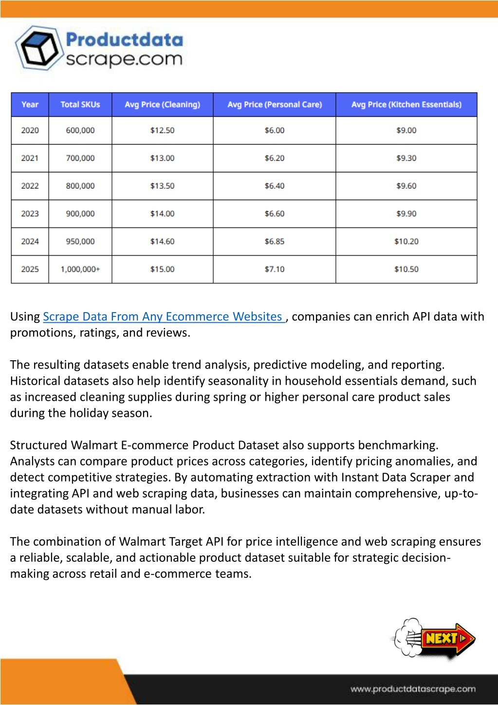 By integrating Retail intelligence through web scraping, analysts can capture additional details such as promotional campaigns, product bundling, and discount periods. Real-time price monitoring not only supports dynamic pricing strategies but also ensures competitive benchmarking. Furthermore, using Instant Data Scraper tools allows businesses to extract price updates multiple times per day without manual intervention. Automated alerts can notify teams of price drops, high-demand items, or sudden changes in inventory. Combining Walmart Target API for price intelligence with automated web scraping ensures a comprehensive and reliable dataset, giving businesses actionable insights to maintain a competitive edge in household essentials retail. Building a Structured Product Dataset Creating a Walmart E-commerce Product Dataset is essential for tracking over 1M SKUs efficiently. Using Walmart Target API for price intelligence, businesses can compile structured data that includes historical pricing, stock availability, categories, and product attributes. From 2020–2025, the number of household essentials SKUs increased from 600,000 to over 1M, requiring scalable and automated data extraction. Custom eCommerce Dataset Scraping allows companies to tailor datasets to specific product types, regions, and categories. For example, tracking electronics household gadgets separately from cleaning and personal care items provides more accurate insights for inventory and pricing analysis. Historical tables reveal trends like SKU growth and price fluctuations: