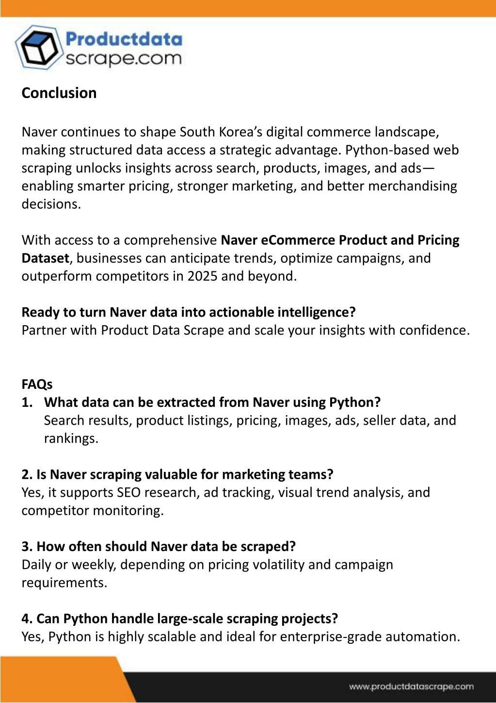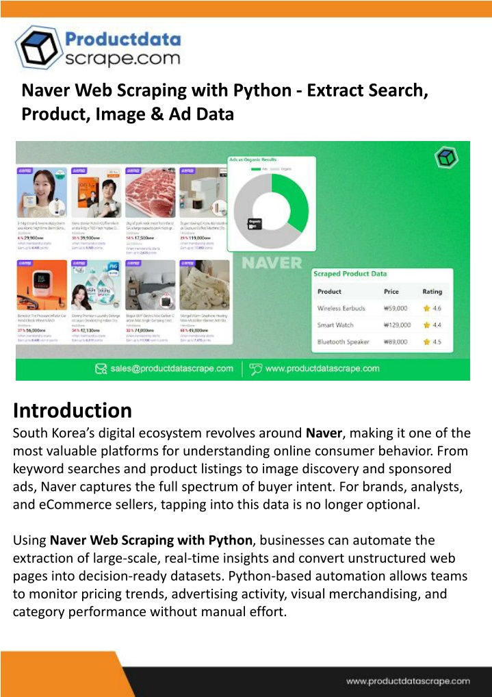 10. Conclusion Naver continues to shape South Korea’s digital commerce landscape, making structured data access a strategic advantage. Python-based web scraping unlocks insights across search, products, images, and ads— enabling smarter pricing, stronger marketing, and better merchandising decisions. With access to a comprehensive Naver eCommerce Product and Pricing Dataset, businesses can anticipate trends, optimize campaigns, and outperform competitors in 2025 and beyond. Ready to turn Naver data into actionable intelligence? Partner with Product Data Scrape and scale your insights with confidence. FAQs 1. What data can be extracted from Naver using Python? Search results, product listings, pricing, images, ads, seller data, and rankings. 2. Is Naver scraping valuable for marketing teams? Yes, it supports SEO research, ad tracking, visual trend analysis, and competitor monitoring. 3. How often should Naver data be scraped? Daily or weekly, depending on pricing volatility and campaign requirements. 4. Can Python handle large-scale scraping projects? Yes, Python is highly scalable and ideal for enterprise-grade automation.