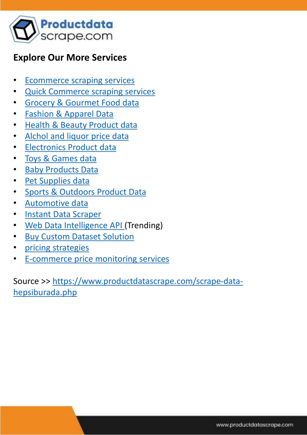 11. Explore Our More Services • • • • • • • • • • • • • • • • • Ecommerce scraping services Quick Commerce scraping services Grocery & Gourmet Food data Fashion & Apparel Data Health & Beauty Product data Alchol and liquor price data Electronics Product data Toys & Games data Baby Products Data Pet Supplies data Sports & Outdoors Product Data Automotive data Instant Data Scraper Web Data Intelligence API (Trending) Buy Custom Dataset Solution pricing strategies E-commerce price monitoring services Source >> https://www.productdatascrape.com/scrape-data- hepsiburada.php