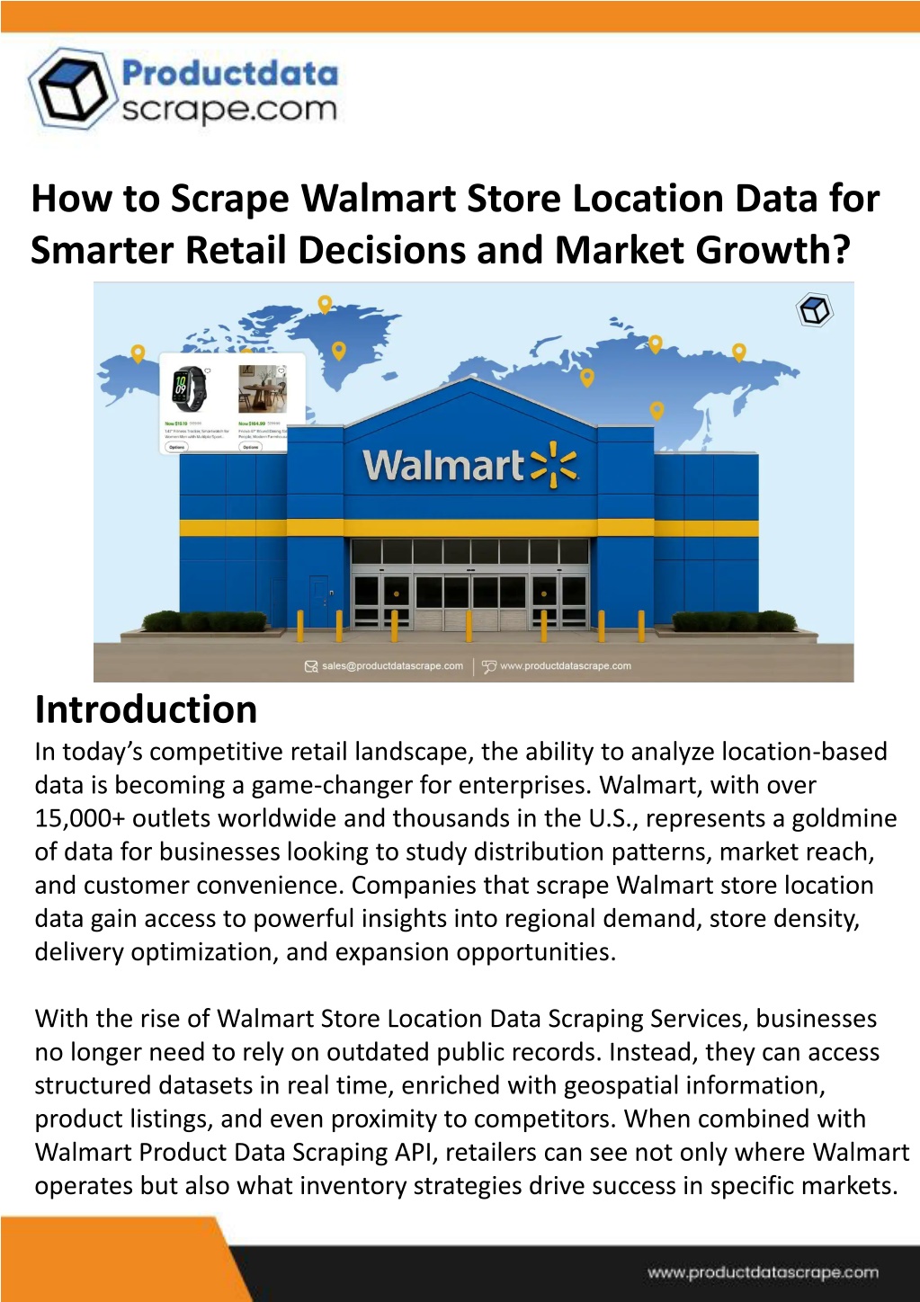 Conclusion Walmart’s vast presence offers businesses an unparalleled opportunity to analyze consumer access, competitor positioning, and market growth strategies. By choosing to scrape Walmart store location data, organizations unlock actionable intelligence that fuels better decisions across supply chains, expansion planning, and digital commerce. From understanding the Walmart store location dataset 2025 to integrating Walmart e-commerce product dataset, businesses gain a 360-degree view of how Walmart dominates retail. These insights help retailers, logistics providers, and manufacturers align operations with consumer demand. As the adoption of data-driven insights continues to rise—from 45% in 2020 to 78% in 2025—the message is clear: the future belongs to data-first businesses. Ready to turn Walmart store and e-commerce data into a competitive advantage? Connect with Product Data Scrape today and explore how our tailored datasets and APIs can transform your growth strategy! Originally published at https://www.productdatascrape.com.