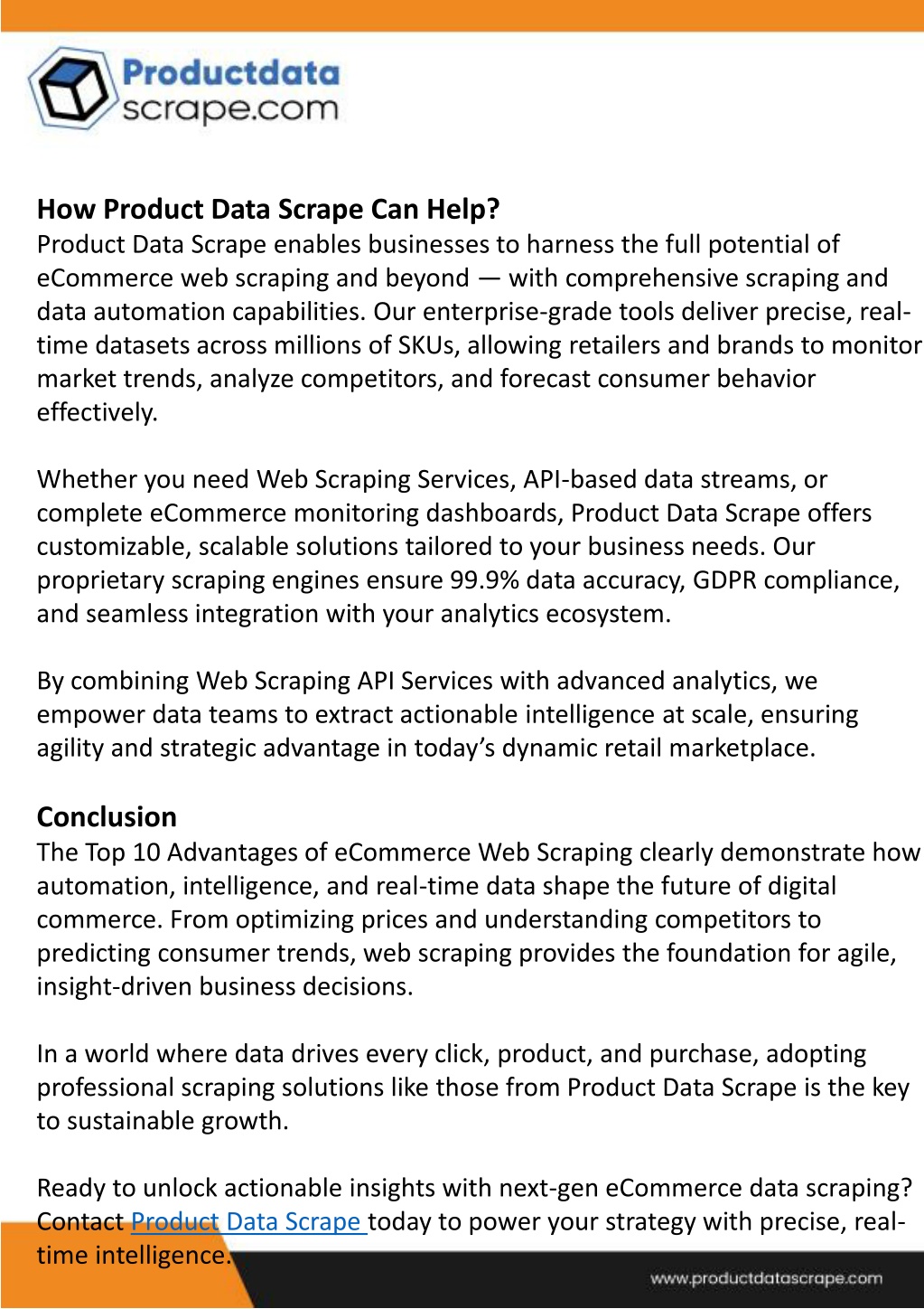 How Product Data Scrape Can Help? Product Data Scrape enables businesses to harness the full potential of eCommerce web scraping and beyond — with comprehensive scraping and data automation capabilities. Our enterprise-grade tools deliver precise, real-time datasets across millions of SKUs, allowing retailers and brands to monitor market trends, analyze competitors, and forecast consumer behavior effectively. Whether you need Web Scraping Services, API-based data streams, or complete eCommerce monitoring dashboards, Product Data Scrape offers customizable, scalable solutions tailored to your business needs. Our proprietary scraping engines ensure 99.9% data accuracy, GDPR compliance, and seamless integration with your analytics ecosystem. By combining Web Scraping API Services with advanced analytics, we empower data teams to extract actionable intelligence at scale, ensuring agility and strategic advantage in today’s dynamic retail marketplace. Conclusion The Top 10 Advantages of eCommerce Web Scraping clearly demonstrate how automation, intelligence, and real-time data shape the future of digital commerce. From optimizing prices and understanding competitors to predicting consumer trends, web scraping provides the foundation for agile, insight-driven business decisions. In a world where data drives every click, product, and purchase, adopting professional scraping solutions like those from Product Data Scrape is the key to sustainable growth. Ready to unlock actionable insights with next-gen eCommerce data scraping? Contact Product Data Scrape today to power your strategy with precise, real-time intelligence.
