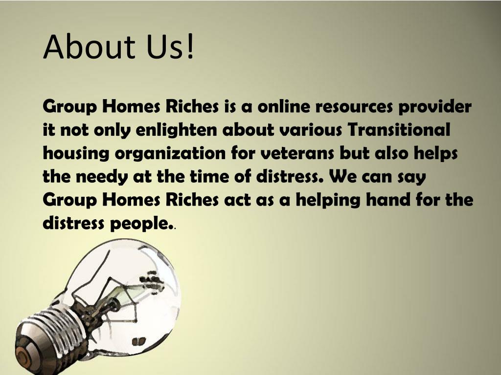 About Us! Group Homes Riches is a online resources provider it not only enlighten about various Transitional housing organization for veterans but also helps the needy at the time of distress. We can say Group Homes Riches act as a helping hand for the distress people..