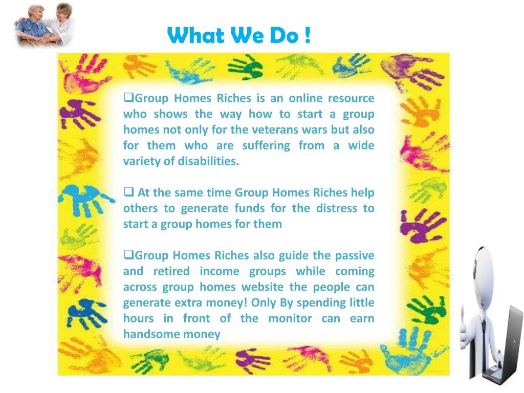 What We Do ! • Group Homes Riches is an online resource who shows the way how to start a group homes not only for the veterans wars but also for them who are suffering from a wide variety of disabilities. • At the same time Group Homes Riches help others to generate funds for the distress to start a group homes for them • Group Homes Riches also guide the passive and retired income groups while coming across group homes website the people can generate extra money! Only By spending little hours in front of the monitor can earn handsome money
