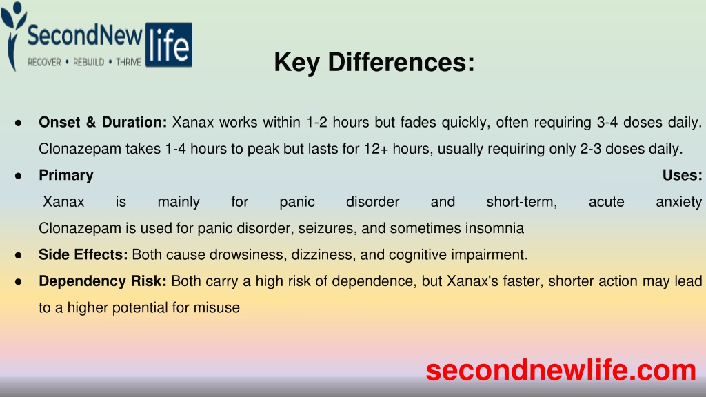 Key Differences: • Onset & Duration: Xanax works within 1-2 hours but fades quickly, often requiring 3-4 doses daily. Clonazepam takes 1-4 hours to peak but lasts for 12+ hours, usually requiring only 2-3 doses daily. • Primary Uses: Xanax is mainly for panic disorder and short-term, acute anxietyClonazepam is used for panic disorder, seizures, and sometimes insomnia • Side Effects: Both cause drowsiness, dizziness, and cognitive impairment. • Dependency Risk: Both carry a high risk of dependence, but Xanax's faster, shorter action may lead to a higher potential for misuse secondnewlife.com