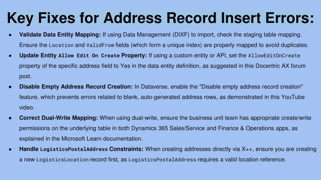 Key Fixes for Address Record Insert Errors: • Validate Data Entity Mapping: If using Data Management (DIXF) to import, check the staging table mapping. Ensure the Location and ValidFrom fields (which form a unique index) are properly mapped to avoid duplicates. • Update Entity Allow Edit On Create Property: If using a custom entity or API, set the AllowEditOnCreate property of the specific address field to Yes in the data entity definition, as suggested in this Docentric AX forum post. • Disable Empty Address Record Creation: In Dataverse, enable the "Disable empty address record creation" feature, which prevents errors related to blank, auto-generated address rows, as demonstrated in this YouTube video. • Correct Dual-Write Mapping: When using dual-write, ensure the business unit team has appropriate create/write permissions on the underlying table in both Dynamics 365 Sales/Service and Finance & Operations apps, as explained in the Microsoft Learn documentation. • Handle LogisticsPostalAddress Constraints: When creating addresses directly via X++, ensure you are creating a new LogisticsLocation record first, as LogisticsPostalAddress requires a valid location reference.