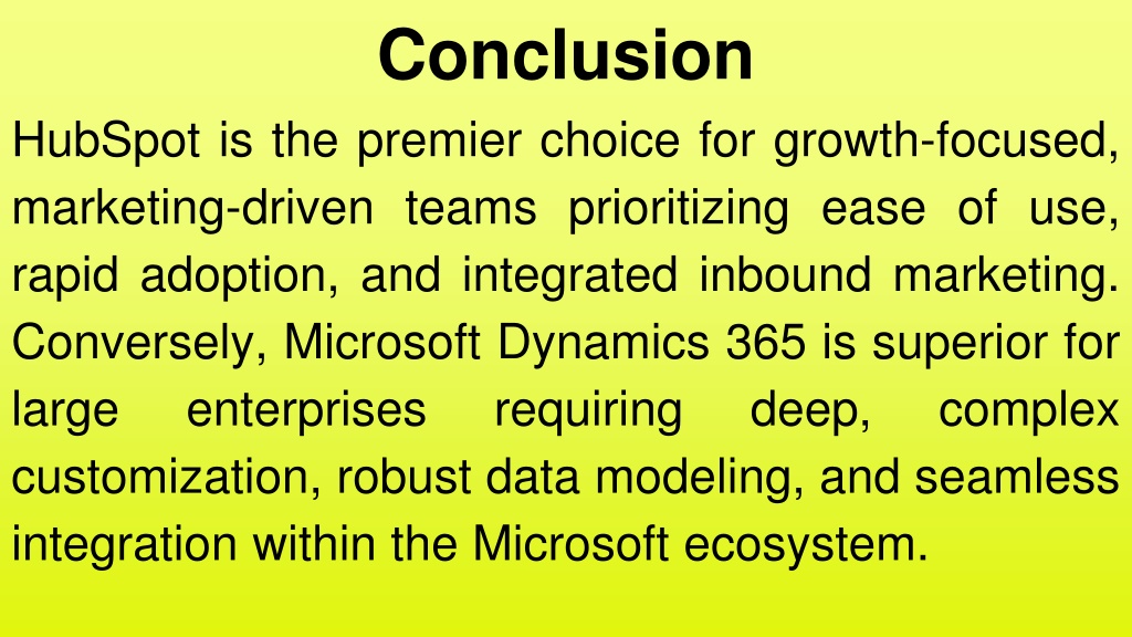 Conclusion HubSpot is the premier choice for growth-focused, marketing-driven teams prioritizing ease of use, rapid adoption, and integrated inbound marketing. Conversely, Microsoft Dynamics 365 is superior for large enterprises requiring deep, complex customization, robust data modeling, and seamless integration within the Microsoft ecosystem.