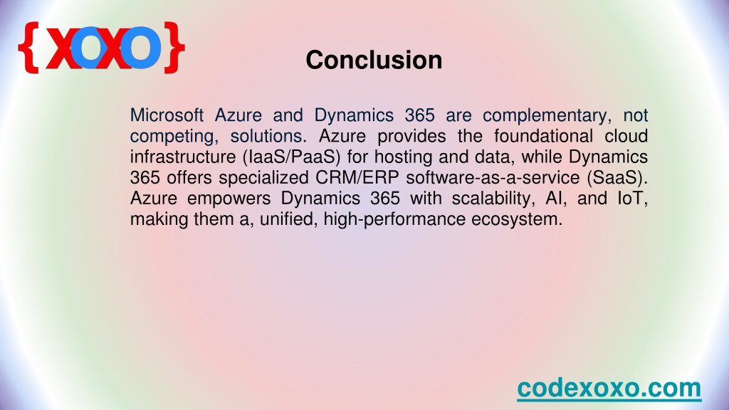 Conclusion Microsoft Azure and Dynamics 365 are complementary, not competing, solutions. Azure provides the foundational cloud infrastructure (IaaS/PaaS) for hosting and data, while Dynamics 365 offers specialized CRM/ERP software-as-a-service (SaaS). Azure empowers Dynamics 365 with scalability, AI, and IoT, making them a, unified, high-performance ecosystem. codexoxo.com