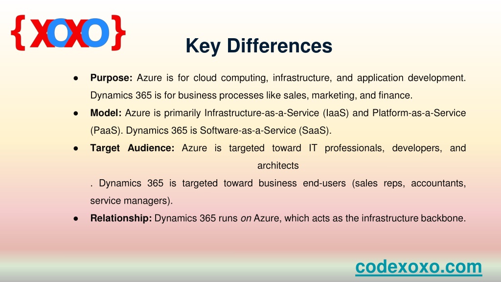 Key Differences • Purpose: Azure is for cloud computing, infrastructure, and application development. Dynamics 365 is for business processes like sales, marketing, and finance. • Model: Azure is primarily Infrastructure-as-a-Service (IaaS) and Platform-as-a-Service (PaaS). Dynamics 365 is Software-as-a-Service (SaaS). • Target Audience: Azure is targeted toward IT professionals, developers, and architects. Dynamics 365 is targeted toward business end-users (sales reps, accountants, service managers). • Relationship: Dynamics 365 runs on Azure, which acts as the infrastructure backbone. codexoxo.com