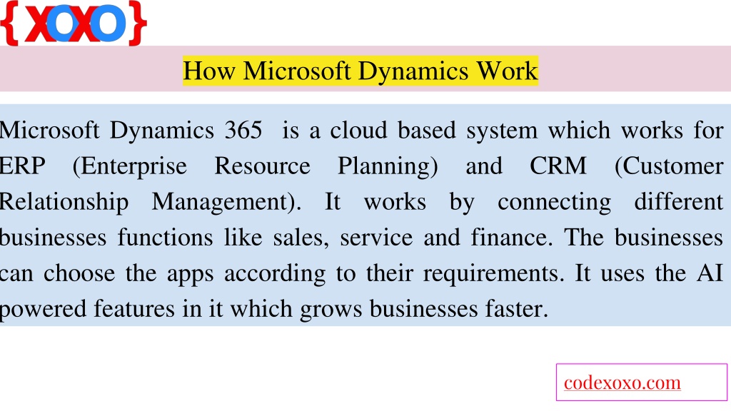 What Is Microsoft Dynamics 365 ? Microsoft Dynamics 365 is a cloud based suite for businesses using the CRM (Customer Relationship management). And ERP (Enterprise Resource Planning). The Platform uses the AI to help organizations grow faster and make quick decision making. codexoxo.com