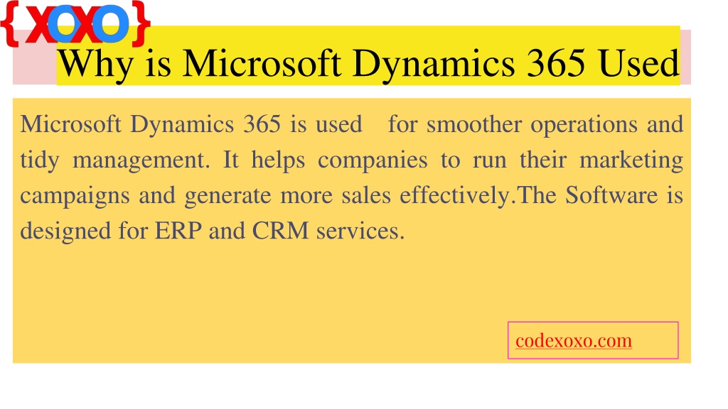 Why is Microsoft Dynamics 365 Used Microsoft Dynamics 365 is used for smoother operations and tidy management. It helps companies to run their marketing campaigns and generate more sales effectively.The Software is designed for ERP and CRM services. codexoxo.com