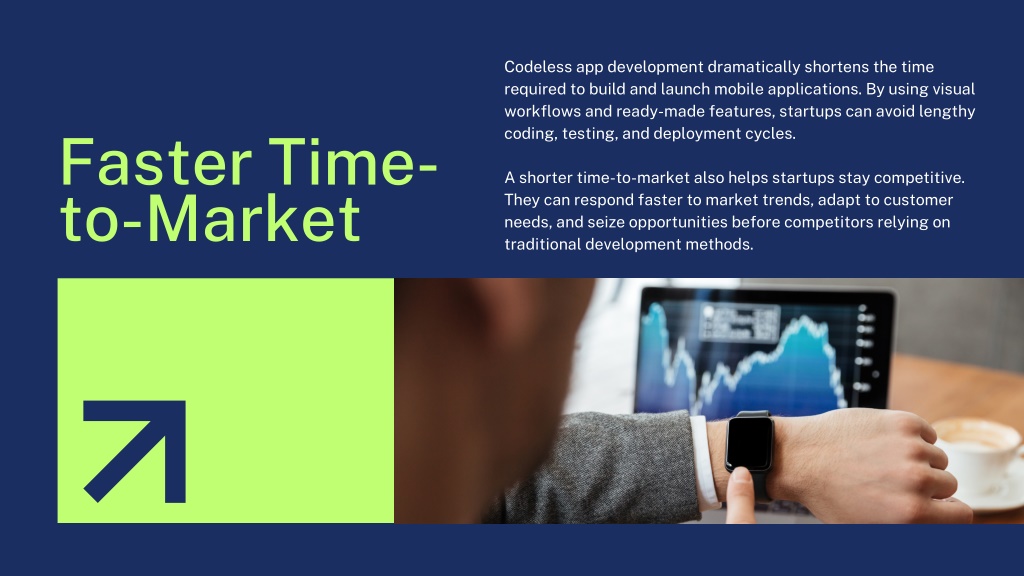 Codeless app development dramatically shortens the time required to build and launch mobile applications. By using visual workflows and ready-made features, startups can avoid lengthy coding, testing, and deployment cycles. Faster Time- to-Market A shorter time-to-market also helps startups stay competitive. They can respond faster to market trends, adapt to customer needs, and seize opportunities before competitors relying on traditional development methods.