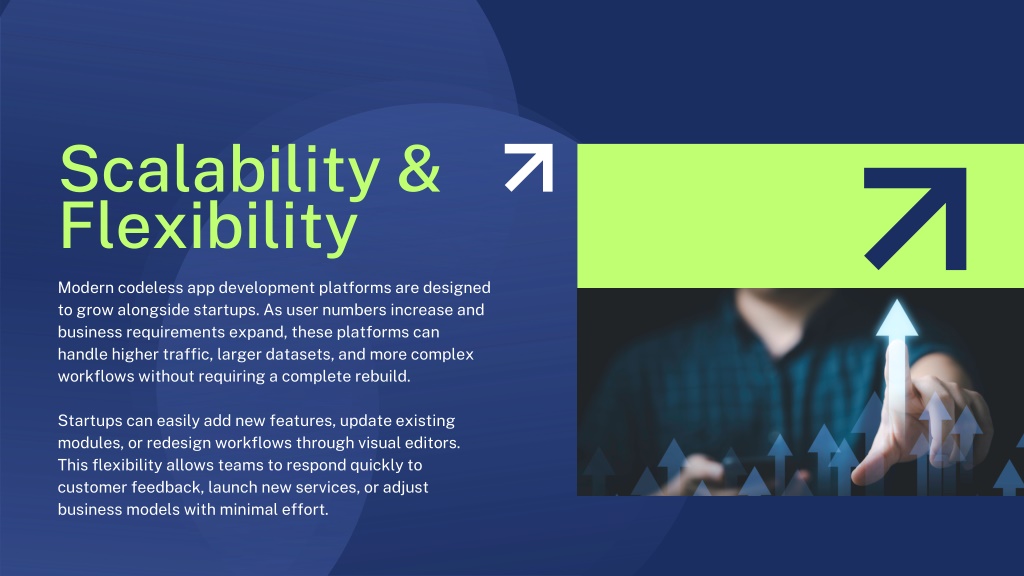 Scalability & Flexibility Modern codeless app development platforms are designed to grow alongside startups. As user numbers increase and business requirements expand, these platforms can handle higher traffic, larger datasets, and more complex workflows without requiring a complete rebuild. Startups can easily add new features, update existing modules, or redesign workflows through visual editors. This flexibility allows teams to respond quickly to customer feedback, launch new services, or adjust business models with minimal effort.