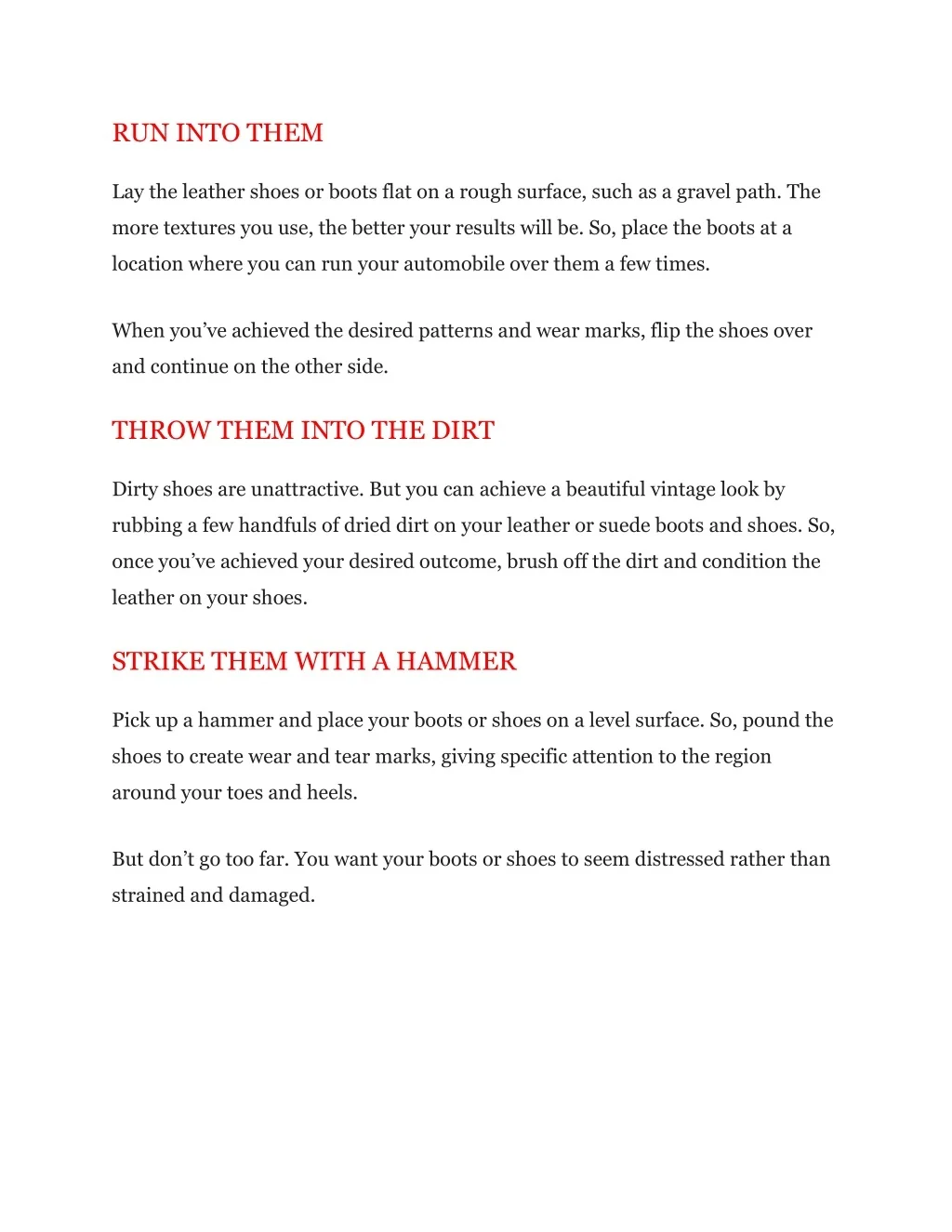 suede footwear. Take your time and pay particular attention to the areas of your shoes or boots that will naturally show greater wear and tear. So, you don’t want to speed through this job and destroy a perfectly nice pair of shoes. After the sandpaper has worked its magic, apply a little coat of leather conditioner to your shoes or boots to seal the deal. BOOZE WET BOOTS Polishing alcohol is a simple and inexpensive technique to give your leather boots or shoes a worn, antique appearance. Spray the alcohol in a spray bottle over your best luxury men’s shoes or boots. Focus on the natural grooves of your shoes using a sponge or a toothbrush for genuinely natural-looking wear. So, squish, crumple, and wrinkle your shoes or boots while they are still moist. This will give your leather or suede shoes or boots a realistic worn appearance. Just be sure to wipe away any extra alcohol with a moist towel. BRUSH THIS UP Grab a stiff-bristled shoe brush and make random swipes over your shoes to impart a little more of a distressed effect. So, for a genuinely aged effect, pay careful attention to places where your shoes would naturally wear and tear. ROCK’ N’ ROLL Find a rock with a few jagged edges that fit well in your palms. To avoid perfect lines, rub the rock’s edges in irregular patterns. This is one of those projects where the raw and random look better. Scuff marks, not straight lines, are what you’re looking for.