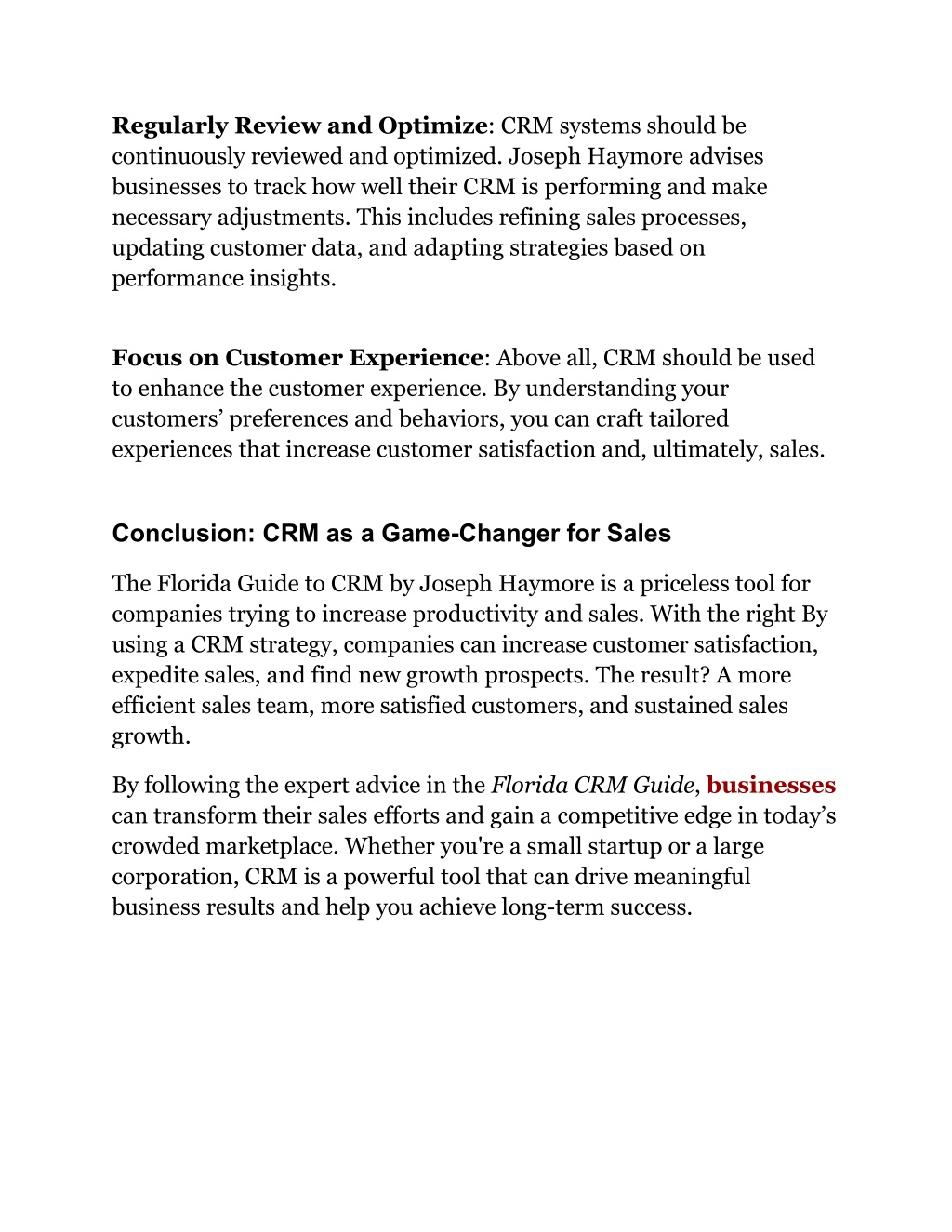 Regularly Review and Optimize: CRM systems should be continuously reviewed and optimized. Joseph Haymore advises businesses to track how well their CRM is performing and make necessary adjustments. This includes refining sales processes, updating customer data, and adapting strategies based on performance insights. Focus on Customer Experience: Above all, CRM should be used to enhance the customer experience. By understanding your customers’ preferences and behaviors, you can craft tailored experiences that increase customer satisfaction and, ultimately, sales. Conclusion: CRM as a Game-Changer for Sales The Florida Guide to CRM by Joseph Haymore is a priceless tool for companies trying to increase productivity and sales. With the right By using a CRM strategy, companies can increase customer satisfaction, expedite sales, and find new growth prospects. The result? A more efficient sales team, more satisfied customers, and sustained sales growth. By following the expert advice in the Florida CRM Guide, businesses can transform their sales efforts and gain a competitive edge in today’s crowded marketplace. Whether you're a small startup or a large corporation, CRM is a powerful tool that can drive meaningful business results and help you achieve long-term success.