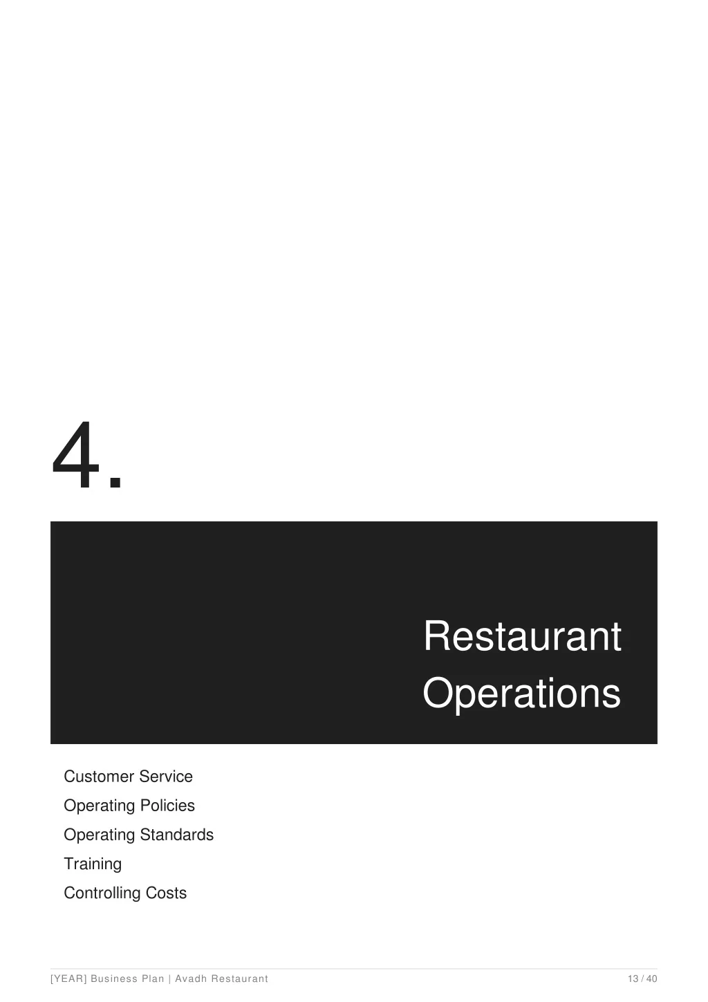 4. Restaurant Operations Customer Service Operating Policies Operating Standards Training Controlling Costs [YEAR] Business Plan | Avadh Restaurant 13 / 40