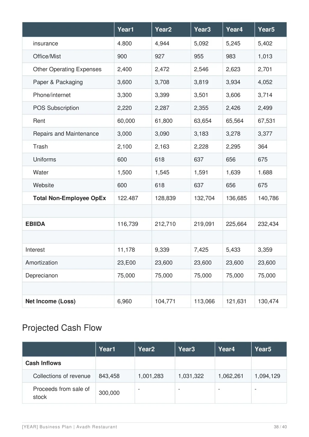 Year1 Year2 Year3 Year4 Year5 insurance 4.800 4,944 5,092 5,245 5,402 Office/Mist 900 927 955 983 1,013 Other Operating Expenses 2,400 2,472 2,546 2,623 2,701 Paper & Packaging 3,600 3,708 3,819 3,934 4,052 Phone/internet 3,300 3,399 3,501 3,606 3,714 POS Subscription 2,220 2,287 2,355 2,426 2,499 Rent 60,000 61,800 63,654 65,564 67,531 Repairs and Maintenance 3,000 3,090 3,183 3,278 3,377 Trash 2,100 2,163 2,228 2,295 364 Uniforms 600 618 637 656 675 Water 1,500 1,545 1,591 1,639 1.688 Website 600 618 637 656 675 Total Non-Employee OpEx 122.487 128,839 132,704 136,685 140,786 EBIIDA 116,739 212,710 219,091 225,664 232,434 Interest 11,178 9,339 7,425 5,433 3,359 Amortization 23,E00 23,600 23,600 23,600 23,600 Deprecianon 75,000 75,000 75,000 75,000 75,000 Net Income (Loss) 6,960 104,771 113,066 121,631 130,474 Projected Cash Flow Year1 Year2 Year3 Year4 Year5 Cash Inflows Collections of revenue 843,458 1,001,283 1,031,322 1,062,261 1,094,129 Proceeds from sale of - - - - 300,000 stock [YEAR] Business Plan | Avadh Restaurant 38 / 40