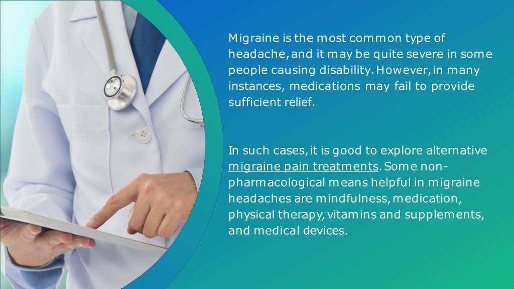 Migraineisthemostcommontypeof headache,anditmaybequitesevereinsome peoplecausingdisability.However,inmany instances, medications may fail to provide sufficientrelief. Insuchcases,itisgoodtoexplorealternative migrainepaintreatments.Somenon- pharmacologicalmeanshelpfulinmigraine headachesaremindfulness,medication, physicaltherapy,vitaminsandsupplements, andmedicaldevices.