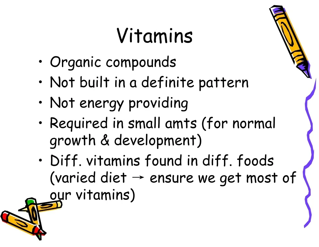 Vitamins • Organic compounds • Not built in a definite pattern • Not energy providing • Required in small amts (for normal growth & development) • Diff. vitamins found in diff. foods (varied diet → ensure we get most of our vitamins)