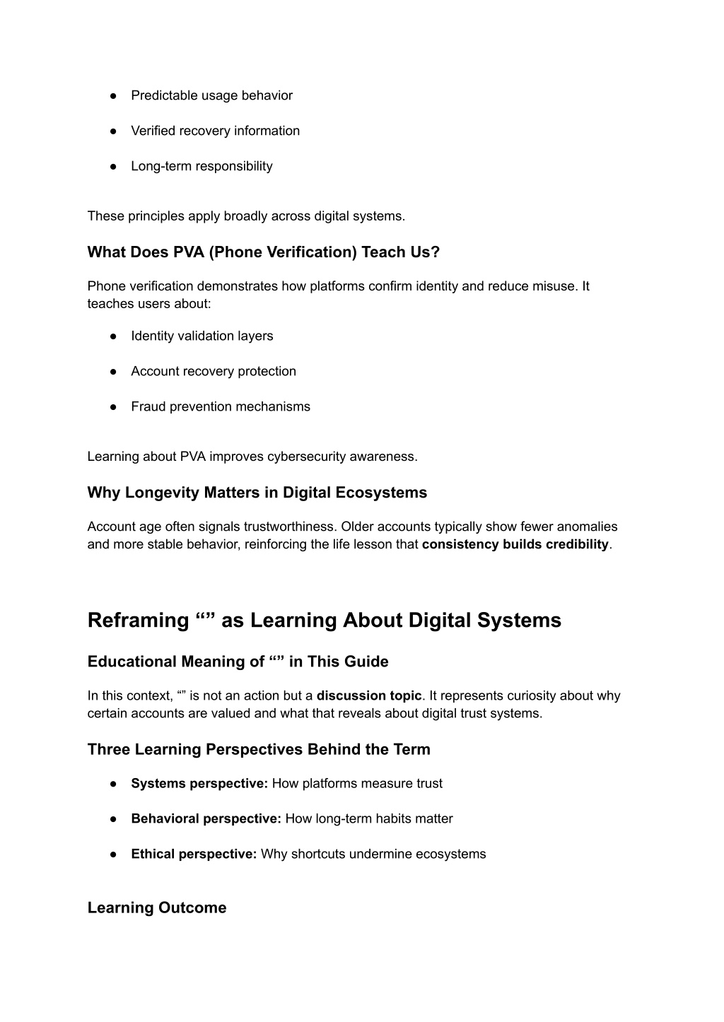 ● Predictable usage behavior ● Verified recovery information ● Long-term responsibility These principles apply broadly across digital systems. What Does PVA (Phone Verification) Teach Us? Phone verification demonstrates how platforms confirm identity and reduce misuse. It teaches users about: ● Identity validation layers ● Account recovery protection ● Fraud prevention mechanisms Learning about PVA improves cybersecurity awareness. Why Longevity Matters in Digital Ecosystems Account age often signals trustworthiness. Older accounts typically show fewer anomalies and more stable behavior, reinforcing the life lesson that consistency builds credibility. Reframing “” as Learning About Digital Systems Educational Meaning of “” in This Guide In this context, “” is not an action but a discussion topic. It represents curiosity about why certain accounts are valued and what that reveals about digital trust systems. Three Learning Perspectives Behind the Term ● Systems perspective: How platforms measure trust ● Behavioral perspective: How long-term habits matter ● Ethical perspective: Why shortcuts undermine ecosystems Learning Outcome