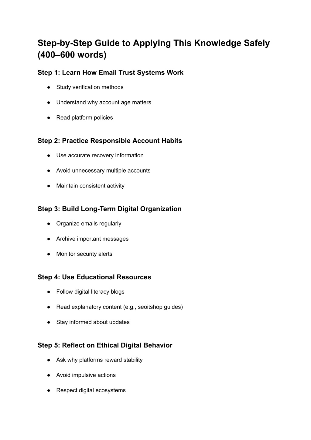 Step-by-Step Guide to Applying This Knowledge Safely (400–600 words) Step 1: Learn How Email Trust Systems Work ● Study verification methods ● Understand why account age matters ● Read platform policies Step 2: Practice Responsible Account Habits ● Use accurate recovery information ● Avoid unnecessary multiple accounts ● Maintain consistent activity Step 3: Build Long-Term Digital Organization ● Organize emails regularly ● Archive important messages ● Monitor security alerts Step 4: Use Educational Resources ● Follow digital literacy blogs ● Read explanatory content (e.g., seoitshop guides) ● Stay informed about updates Step 5: Reflect on Ethical Digital Behavior ● Ask why platforms reward stability ● Avoid impulsive actions ● Respect digital ecosystems