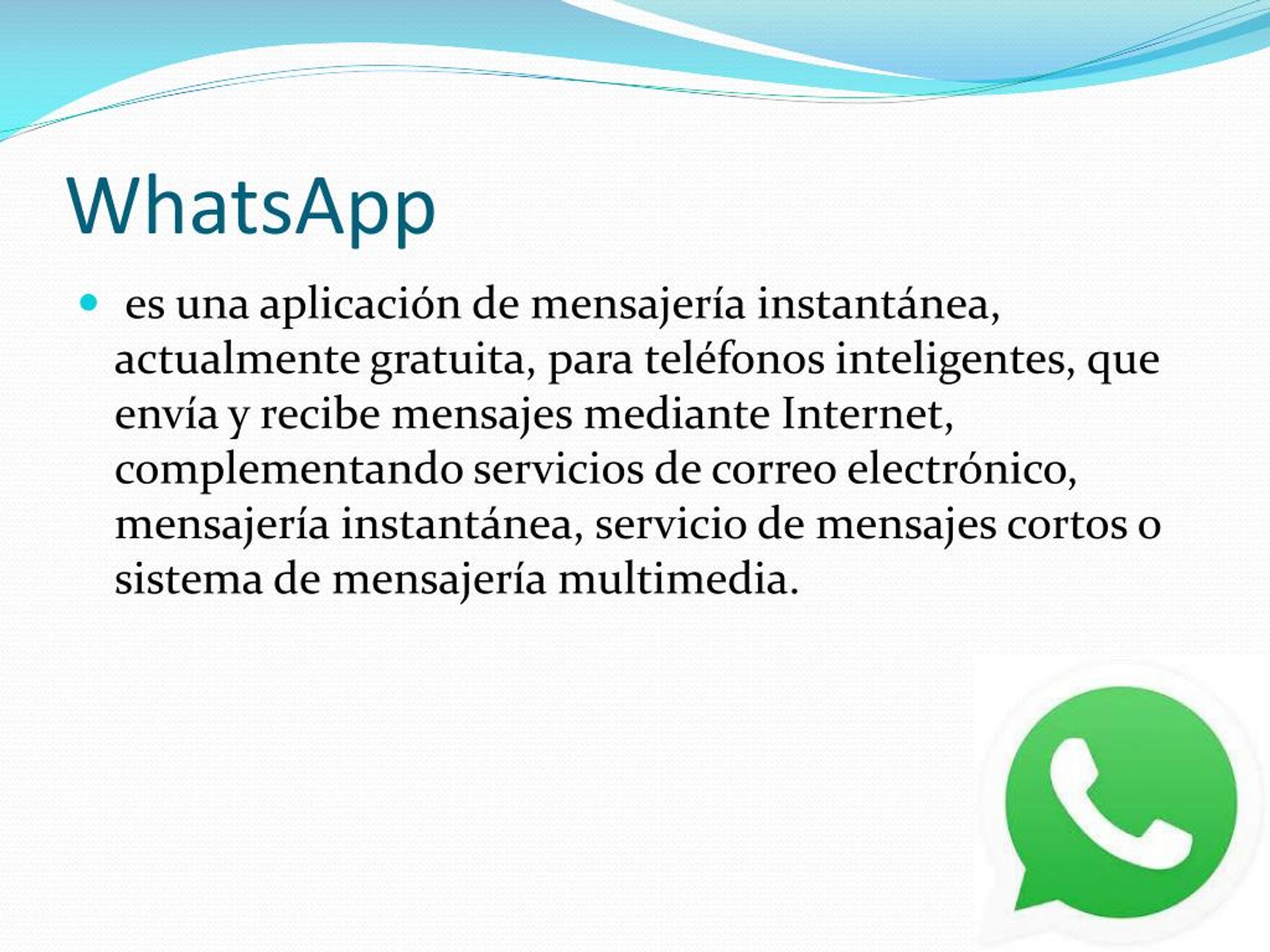 WhatsApp • es una aplicación de mensajería instantánea, actualmente gratuita, para teléfonos inteligentes, que envía y recibe mensajes mediante Internet, complementando servicios de correo electrónico, mensajería instantánea, servicio de mensajes cortos o sistema de mensajería multimedia.
