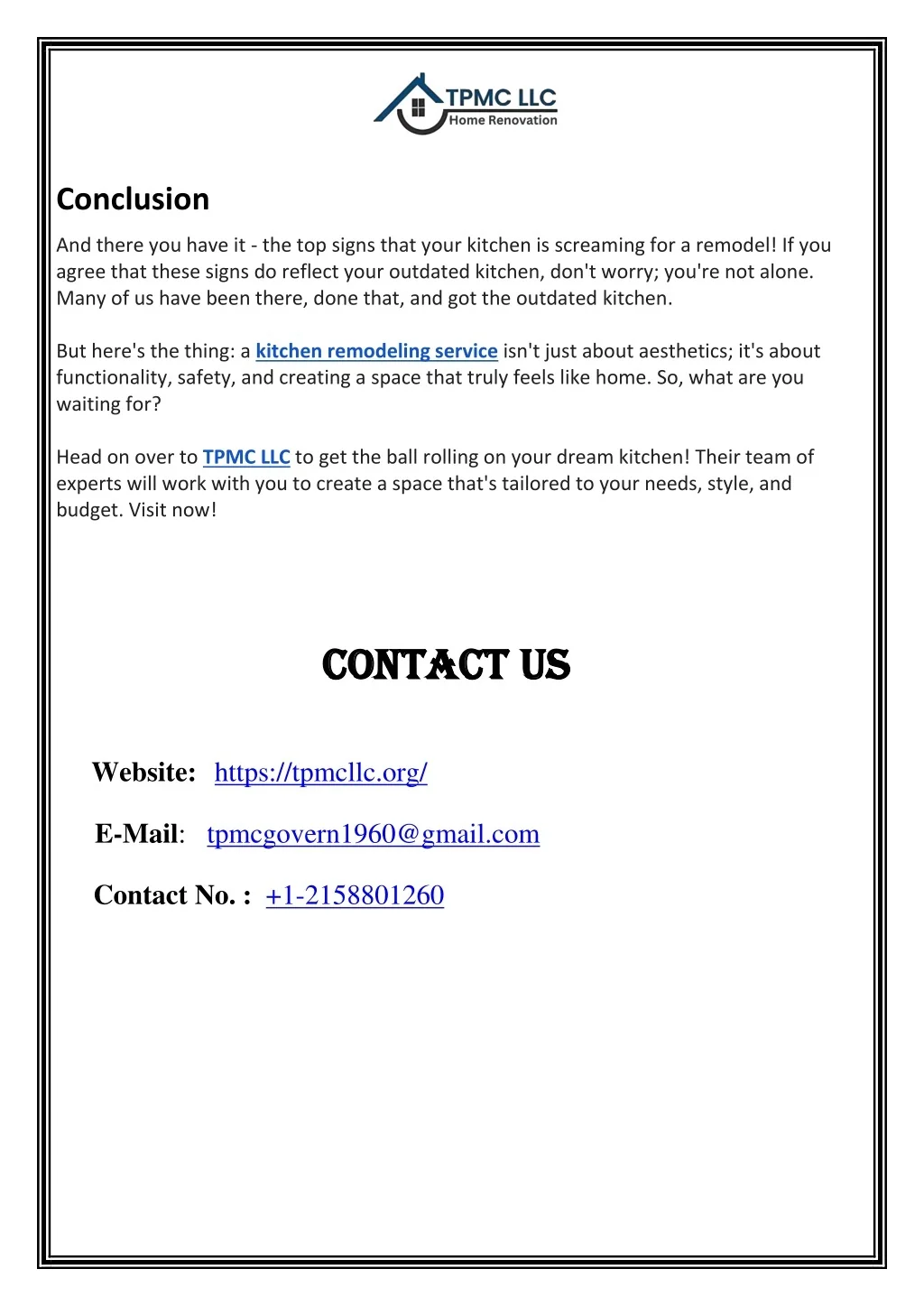 Conclusion And there you have it - the top signs that your kitchen is screaming for a remodel! If you agree that these signs do reflect your outdated kitchen, don't worry; you're not alone. Many of us have been there, done that, and got the outdated kitchen. But here's the thing: a kitchen remodeling service isn't just about aesthetics; it's about functionality, safety, and creating a space that truly feels like home. So, what are you waiting for? Head on over to TPMC LLC to get the ball rolling on your dream kitchen! Their team of experts will work with you to create a space that's tailored to your needs, style, and budget. Visit now! Contact Us Contact Us Website: https://tpmcllc.org/ E-Mail: tpmcgovern1960@gmail.com Contact No. : +1-2158801260