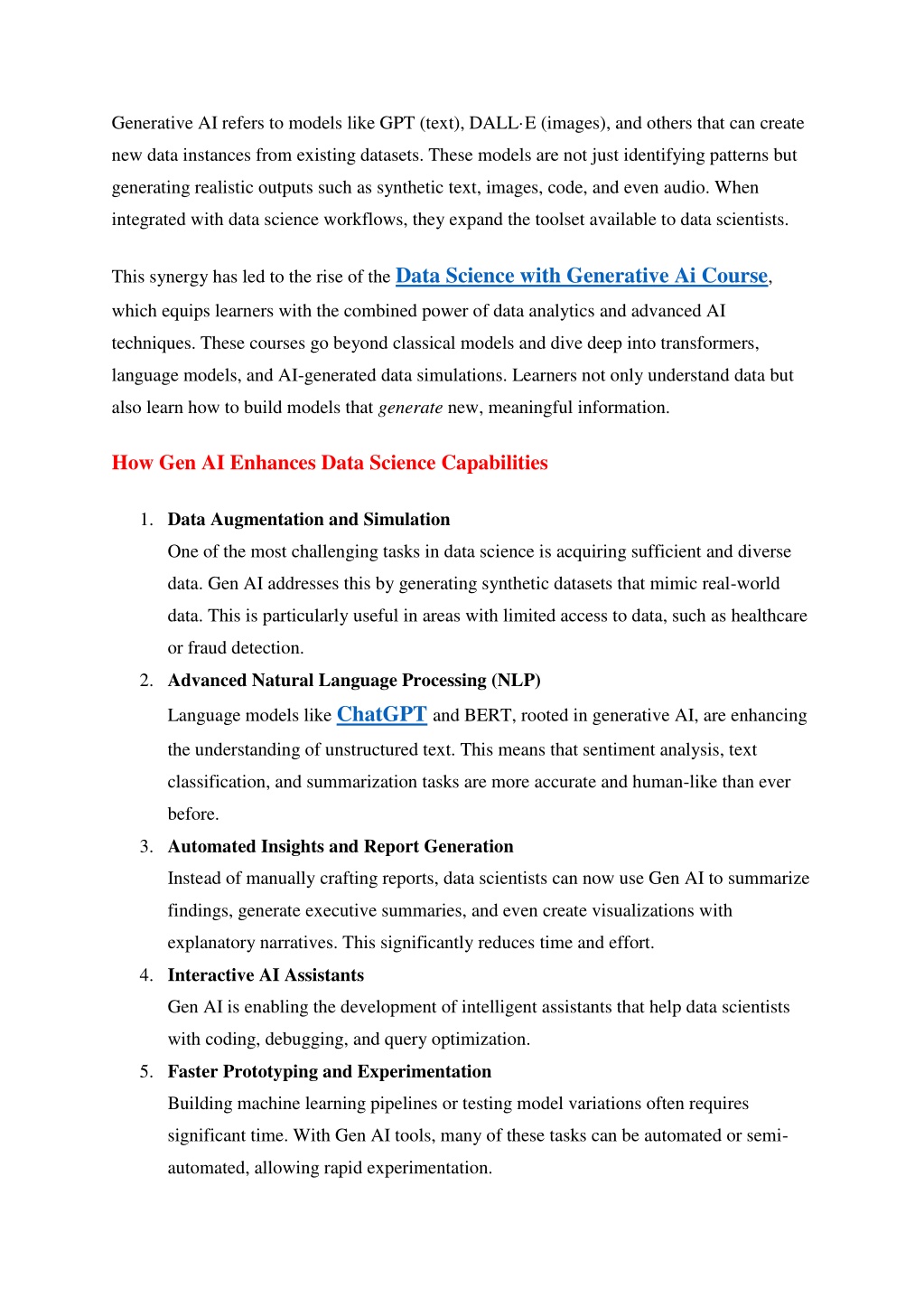 Generative AI refers to models like GPT (text), DALL·E (images), and others that can create new data instances from existing datasets. These models are not just identifying patterns but generating realistic outputs such as synthetic text, images, code, and even audio. When integrated with data science workflows, they expand the toolset available to data scientists. This synergy has led to the rise of the Data Science with Generative Ai Course, which equips learners with the combined power of data analytics and advanced AI techniques. These courses go beyond classical models and dive deep into transformers, language models, and AI-generated data simulations. Learners not only understand data but also learn how to build models that generate new, meaningful information. How Gen AI Enhances Data Science Capabilities 1.Data Augmentation and Simulation One of the most challenging tasks in data science is acquiring sufficient and diverse data. Gen AI addresses this by generating synthetic datasets that mimic real-world data. This is particularly useful in areas with limited access to data, such as healthcare or fraud detection. 2.Advanced Natural Language Processing (NLP) Language models like ChatGPTand BERT, rooted in generative AI, are enhancing the understanding of unstructured text. This means that sentiment analysis, text classification, and summarization tasks are more accurate and human-like than ever before. 3.Automated Insights and Report Generation Instead of manually crafting reports, data scientists can now use Gen AI to summarize findings, generate executive summaries, and even create visualizations with explanatory narratives. This significantly reduces time and effort. 4.Interactive AI Assistants Gen AI is enabling the development of intelligent assistants that help data scientists with coding, debugging, and query optimization. 5.Faster Prototyping and Experimentation Building machine learning pipelines or testing model variations often requires significant time. With Gen AI tools, many of these tasks can be automated or semi- automated, allowing rapid experimentation.