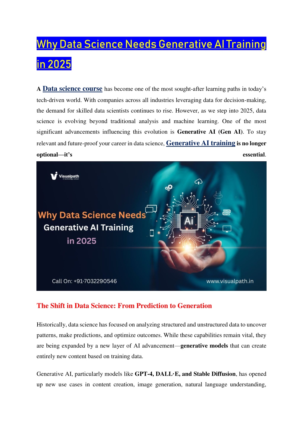 Why Data Science Needs Generative AI Training in 2025 A Data science coursehas become one of the most sought-after learning paths in today’s tech-driven world. With companies across all industries leveraging data for decision-making, the demand for skilled data scientists continues to rise. However, as we step into 2025, data science is evolving beyond traditional analysis and machine learning. One of the most significant advancements influencing this evolution is Generative AI (Gen AI). To stay relevant and future-proof your career in data science, Generative AI training is no longer optional—it’s essential. The Shift in Data Science: From Prediction to Generation Historically, data science has focused on analyzing structured and unstructured data to uncover patterns, make predictions, and optimize outcomes. While these capabilities remain vital, they are being expanded by a new layer of AI advancement—generative models that can create entirely new content based on training data. Generative AI, particularly models like GPT-4, DALL·E, and Stable Diffusion, has opened up new use cases in content creation, image generation, natural language understanding,