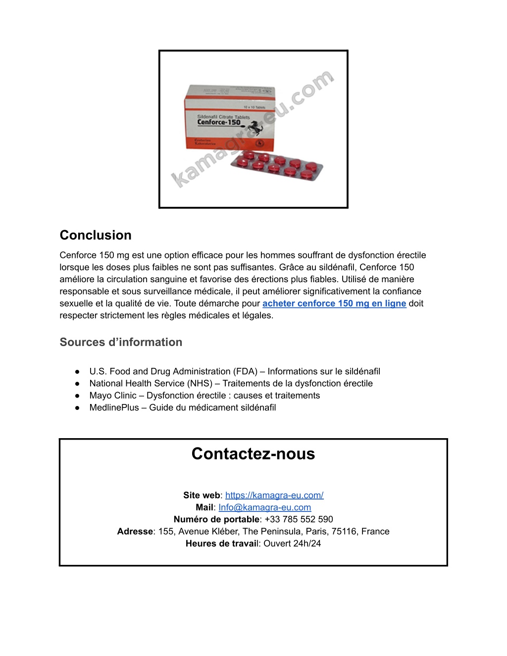 Conclusion Cenforce 150 mg est une option efficace pour les hommes souffrant de dysfonction érectile lorsque les doses plus faibles ne sont pas suffisantes. Grâce au sildénafil, Cenforce 150 améliore la circulation sanguine et favorise des érections plus fiables. Utilisé de manière responsable et sous surveillance médicale, il peut améliorer significativement la confiance sexuelle et la qualité de vie. Toute démarche pour acheter cenforce 150 mg en ligne doit respecter strictement les règles médicales et légales. Sources d’information ● U.S. Food and Drug Administration (FDA) – Informations sur le sildénafil ● National Health Service (NHS) – Traitements de la dysfonction érectile ● Mayo Clinic – Dysfonction érectile : causes et traitements ● MedlinePlus – Guide du médicament sildénafil Contactez-nous Site web: https://kamagra-eu.com/ Mail: Info@kamagra-eu.com Numéro de portable: +33 785 552 590 Adresse: 155, Avenue Kléber, The Peninsula, Paris, 75116, France Heures de travail: Ouvert 24h/24