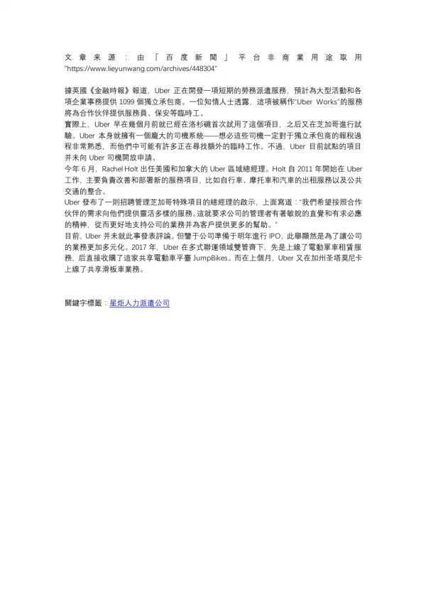 文 "https://www.lieyunwang.com/archives/448304" 據英國《金融時報》報道,Uber 正在開發一項短期的勞務派遣服務,預計為大型活動和各 項企業事務提供 1099 個獨立承包商。一位知情人士透露,這項被稱作“Uber Works”的服務 將為合作伙伴提供服務員、保安等臨時工。 實際上,Uber 早在幾個月前就已經在洛杉磯首次試用了這個項目,之后又在芝加哥進行試 驗。Uber 本身就擁有一個龐大的司機系統——想必這些司機一定對于獨立承包商的報稅過 程非常熟悉,而他們中可能有許多正在尋找額外的臨時工作。不過,Uber 目前試點的項目 并未向 Uber 司機開放申請。 今年 6 月,Rachel Holt 出任美國和加拿大的 Uber 區域總經理。Holt 自 2011 年開始在 Uber 工作,主要負責改善和部署新的服務項目,比如自行車、摩托車和汽車的出租服務以及公共 交通的整合。 Uber 發布了一則招聘管理芝加哥特殊項目的總經理的啟示,上面寫道:“我們希望按照合作 伙伴的需求向他們提供靈活多樣的服務。 這就要求公司的管理者有著敏銳的直覺和有求必應 的精神,從而更好地支持公司的業務并為客戶提供更多的幫助。” 目前, Uber 并未就此事發表評論。 但鑒于公司準備于明年進行 IPO, 此舉顯然是為了讓公司 的業務更加多元化。2017 年,Uber 在多式聯運領域雙管齊下,先是上線了電動單車租賃服 務,后直接收購了這家共享電動車平臺 JumpBikes。而在上個月,Uber 又在加州圣塔莫尼卡 上線了共享滑板車業務。 關鍵字標籤:星炬人力派遣公司 章 来 源 : 由 「 百 度 新 聞 」 平 台 非 商 業 用 途 取 用