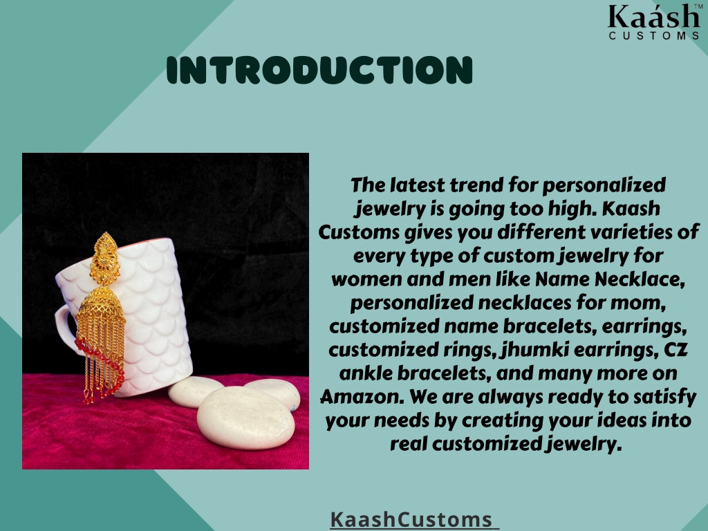 Introduction The latest trend for personalized jewelry is going too high. Kaash Customs gives you different varieties of every type of custom jewelry for women and men like Name Necklace, personalized necklaces for mom, customized name bracelets, earrings, customized rings, jhumki earrings, CZ ankle bracelets, and many more on Amazon. We are always ready to satisfy your needs by creating your ideas into real customized jewelry. https://kaashusa.com/ KaashCustoms