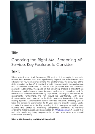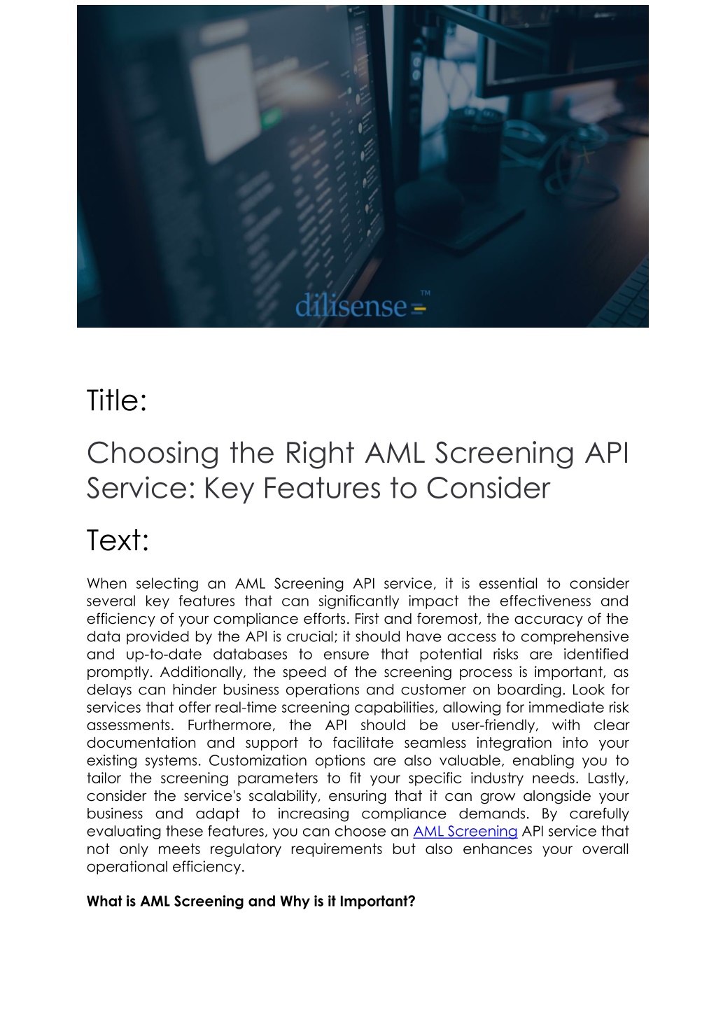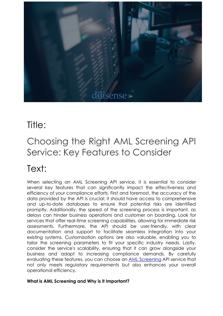 Title: Choosing the Right AML Screening API Service: Key Features to Consider Text: When selecting an AML Screening API service, it is essential to consider several key features that can significantly impact the effectiveness and efficiency of your compliance efforts. First and foremost, the accuracy of the data provided by the API is crucial; it should have access to comprehensive and up-to-date databases to ensure that potential risks are identified promptly. Additionally, the speed of the screening process is important, as delays can hinder business operations and customer on boarding. Look for services that offer real-time screening capabilities, allowing for immediate risk assessments. Furthermore, the API should be user-friendly, with clear documentation and support to facilitate seamless integration into your existing systems. Customization options are also valuable, enabling you to tailor the screening parameters to fit your specific industry needs. Lastly, consider the service's scalability, ensuring that it can grow alongside your business and adapt to increasing compliance demands. By carefully evaluating these features, you can choose an AML Screening API service that not only meets regulatory requirements but also enhances your overall operational efficiency. What is AML Screening and Why is it Important?