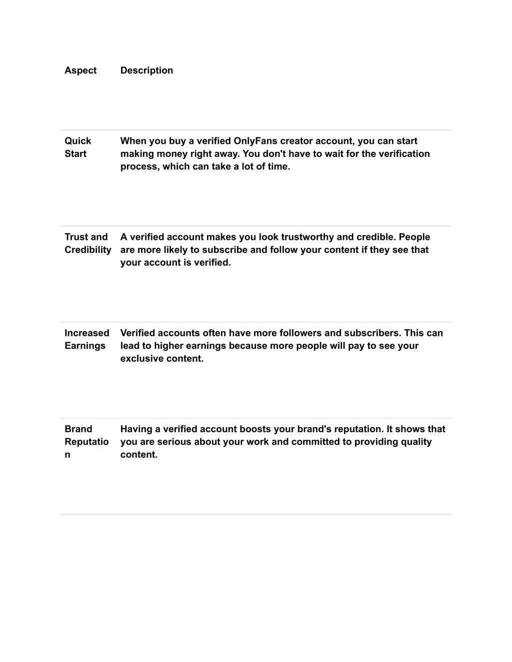 Aspect Description Quick Start When you buy a verified OnlyFans creator account, you can start making money right away. You don't have to wait for the verification process, which can take a lot of time. Trust and Credibility A verified account makes you look trustworthy and credible. People are more likely to subscribe and follow your content if they see that your account is verified. Increased Earnings Verified accounts often have more followers and subscribers. This can lead to higher earnings because more people will pay to see your exclusive content. Brand Reputatio n Having a verified account boosts your brand's reputation. It shows that you are serious about your work and committed to providing quality content.