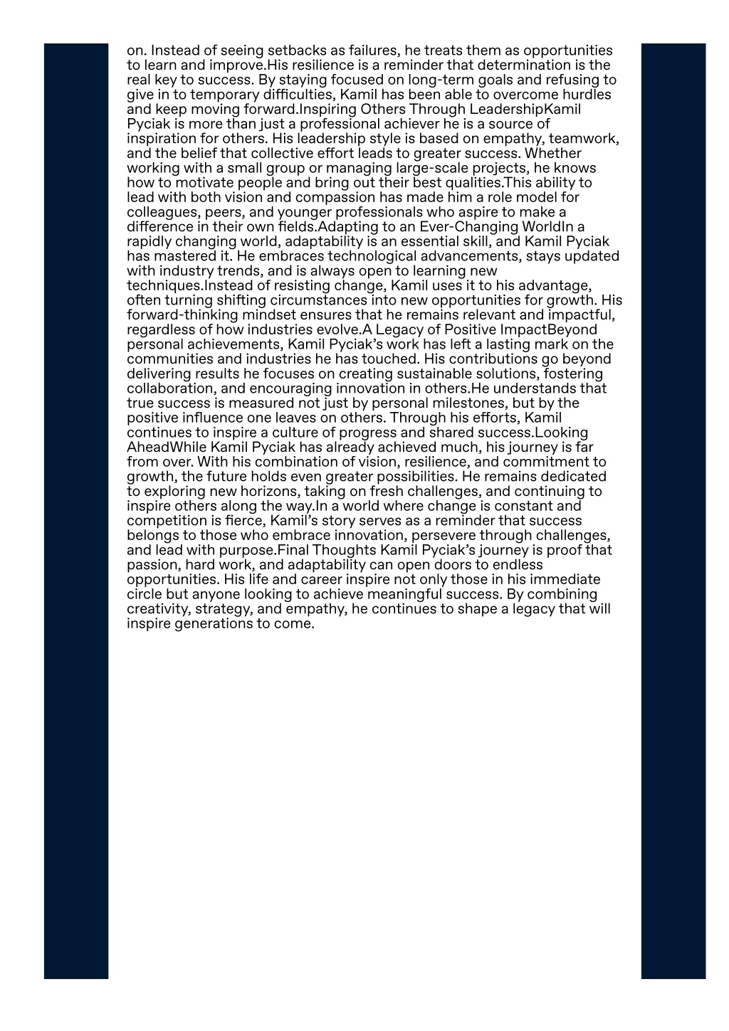 journey:Stay curious: Curiosity is the foundation of growth.Think di?erently: Innovation starts when you step outside conventional thinking.Stay resilient: Setbacks are not failures but opportunities to grow stronger.Make an impact: Success is more fulfilling when it benefits others.By internalizing these lessons, anyone can align their journey with the principles that guide Kamil Pyciak.ConclusionThe journey of Kamil Pyciak is one of vision, innovation, and impact. His life demonstrates the importance of combining creativity with resilience, leadership with empathy, and success with responsibility. In a world filled with challenges and uncertainties, his story serves as a beacon of inspiration for those who dare to dream and act with purpose.Ultimately, the legacy of Kamil Pyciak is not just about personal achievements it is about inspiring growth, sparking innovation, and creating lasting positive change. His journey reminds us that with determination, adaptability, and vision, we too can leave an impact that echoes for generations to come.