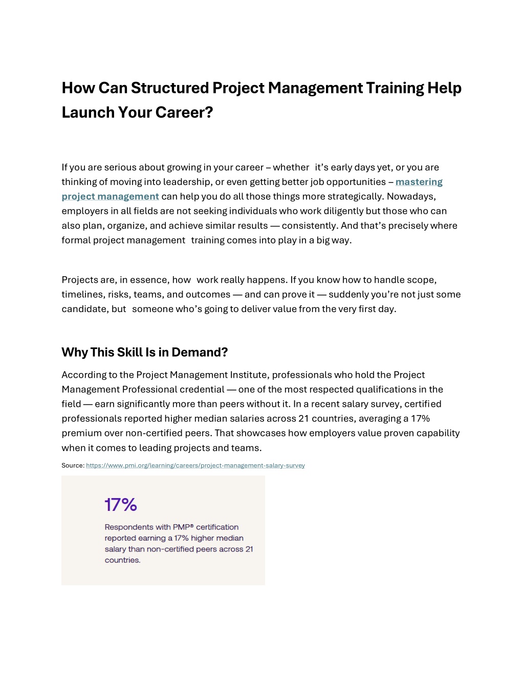 How Can Structured Project Management Training Help Launch Your Career? If you are serious about growing in your career – whetherit’s early days yet, or you are thinking of moving into leadership, or even getting better job opportunities –mastering project management can help you do all those things more strategically. Nowadays, employers in all fields are not seeking individuals who work diligently but those who can also plan, organize, and achieve similar results —consistently. And that’s precisely where formal project managementtraining comes into play in a big way. Projects are, in essence, howwork really happens. If you know how to handle scope, timelines, risks, teams, and outcomes — and can prove it —suddenly you’re not just some candidate, butsomeone who’s going to deliver value from the very first day. Why This Skill Is in Demand? According to the Project Management Institute, professionals who hold the Project Management Professional credential — one of the most respected qualifications in the field — earn significantly more than peers without it. In a recent salary survey, certified professionals reported higher median salaries across 21 countries, averaging a 17% premium over non-certified peers. That showcases how employers value proven capability when it comes to leading projects and teams. Source: https://www.pmi.org/learning/careers/project-management-salary-survey