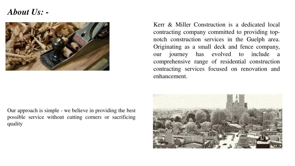 About Us: - Kerr & Miller Construction is a dedicated local contracting company committed to providing top-notch construction services in the Guelph area. Originating as a small deck and fence company, our journey has evolved to include a comprehensive range of residential construction contracting services focused on renovation and enhancement. Our approach is simple - we believe in providing the best possible service without cutting corners or sacrificing quality